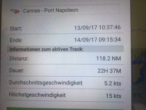 Nach einer Stunde nahm der Wind kräftig zu. Mistral vom Feinsten und direkt von vorne. Normalerweise Zeit beizudrehen und in einer geschützten Bucht abwarten bis es ruhiger wird. Wir nahmen es als willkommenen Test zu prüfen, ob wir Seekrank werden. War nix mit Seekrank. Aber das Wasser, welches durch die Notausstiege rein kam war schon gewaltig. Jetzt weiß ich, was die Angelsachsen meinen wenn sie horsing ( oder so) sagen. Es ging heftig rauf und runter. Das Boot wurde oft vom 💦 überspült. Aber alles im grünen Bereich. Mit beiden Maschinen ging es mit 5 Knoten gegenan. Hinter Hyers wurdet es ruhiger und unsere erste Nachtfahrt war ein Erlebnis! Cherie von 21 – 24 Uhr. Ich von 0 – 3 Uhr und Udo von 3 – 6 Uhr. Alles easy und mit Radar sieht man auch die Fischerbote die gerne ihr AIS ausschalten. 😊👍 Alles super.