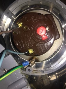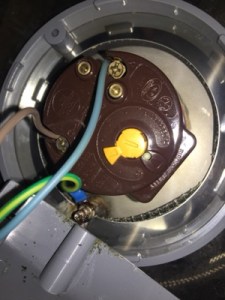 Hier der alte Zustand. Am Erdanschluss war es feucht wegen der angegammelten Stellen. Und die Kabel ohne Hülse in der Klemme, Profis gibt es . . .