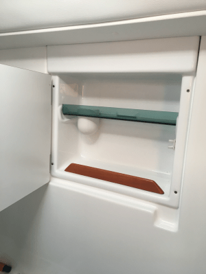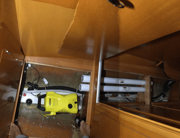 Dann wollen noch die drei Schmutzfilter untergebracht werden. Da muss man ab und an dran und es ist Wasserpanschen angesagt. Also das Gästebad ist wieder dran. Als Ablage für Kleinigkeiten (Waschbeutel) gut zu nutzen. Die Filter sind später der einzige sichtbare Hinweis auf den Wassermacher.