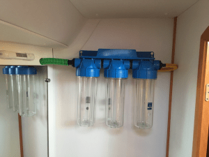 Deshalb ist er auch in einer besonderen Röhre (Druckbehälter aus Faserverbund) untergrbracht. Aus diesem Filter kommen zwei Leitungen mit Wasser raus, einmal super Trinkwasser und einmal sehr salziges Meerwasser. Das Meerwasser (die Fachleute nennen das „Brine“) geht über Bord, also Ausguss. Das Trinkwasser geht in den Wassertank zum späteren Gebrauch.