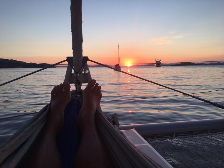 Südlicher wird es ruhiger und wir sind mit unserer Lagoon kräftig Höhe gelaufen, also gekreuzt. Ging besser als gedacht.