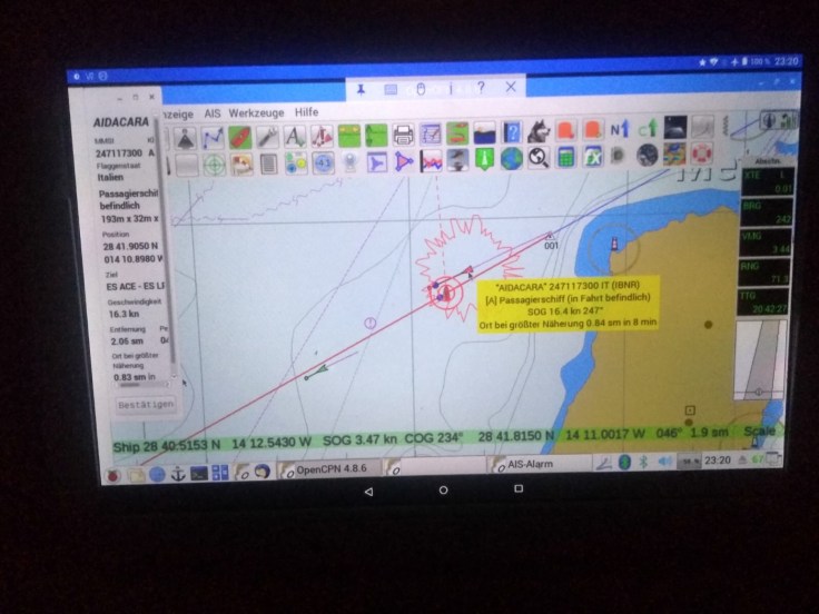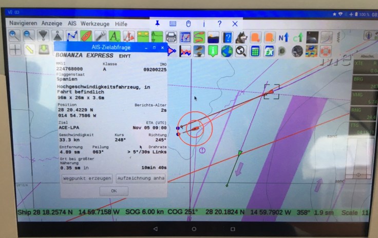 Die kamen uns recht nah. Der Wachhabende hat auf ihren Wunsch den Kurs geändert und etwas mehr Abstand beim Überholen gelassen. Ich hatte am frühen Morgen die Schnellfähre (30kn) direkt von hinten auf Kollisionskurs im AIS. Nach dreimal anfunken meldete sich der Wachhabende und fragte, ob wir das Segelboot vor ihm seien. Nach Bestätigung (war also doch kein Fehler in der Anzeige😎) sagte er zu, den Kurs zu ändern. Wenige Minuten später war er am Horizont zu sehen und kurze Momente weiter an uns vorbei.