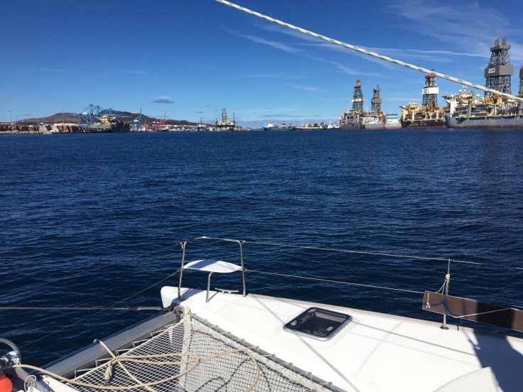 Kurz vor Gran Canaria kommt ein Verkehrstrennungsgebiet. Das ist ne „Autobahn “ für Berufsschiffe. Wir kleinen Pupser müssen uns da demütig auf kürzestem Weg ohne die Pötte zu stören durchschlängeln. Da der Wind schwächelte, kam unser VOLVO zum Einsatz. Und schon ist Las Palmas vor uns gut zu erkennen. Obwohl wir Gran Canaria schon aus über 50 nm Abstand an den hell orange leuchtenden Wolken ausmachen konnten. Das ist Lichtsmog vom Feinsten.