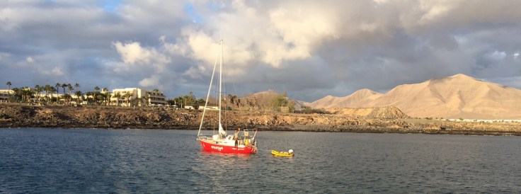 Nach dem Tanken (Durchschnittsverbrauch:1,25 l/h bei ca. 4,5 kn Fahrt 😊) ging es in das Ankerfeld vor der Marina Rubicon. Dort haben wir noch einen Fehler an unserem Hahnepot ( Ankerleine) korrigiert, lecker gegessen und uns von der Aracanga ( Ricki und Martin) verabschiedet. Wir sehen uns in der Karibik wieder!