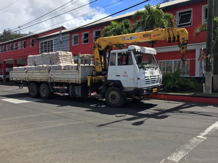 Der Truck (China AID) brachte Baumaterial vom Containerterminal auf eine Schute. Das Material ist für Carriacou bestimmt. Die Chinesen können (angeblich) kein Englisch. Schade.