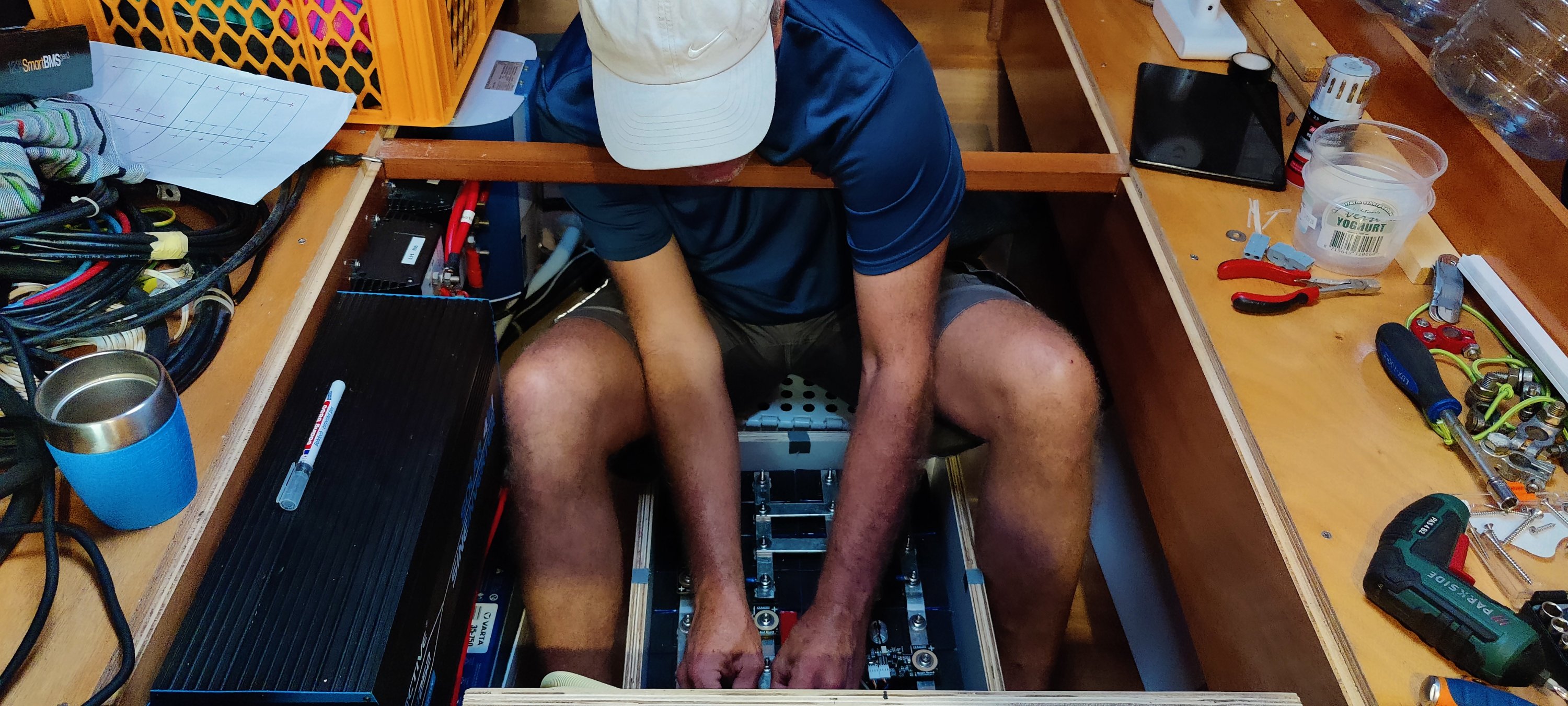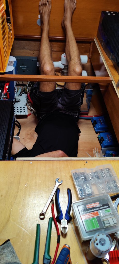 Die alten Starkstromkabel identifizieren und sortieren. Die Stromschienen ohne Bohrständer anfertigen. Alle Kabel sorgfältig verlegen und sicher fixieren. Das braucht mehr Zeit als gedacht. Und bei über 30⁰C geht es auch etwas langsamer 😅 Die Beschaffung der Batterien in China war auch spannend: FedEx hat zwischendurch die Sendungsnummer geändert. Damit waren die Batterien für gut 4 Wochen in USA verschollen. Die Hilfe von Judith im Office der Varadero Marina war unschätzbar wertvoll. Danke dafür! Insgesamt hat das Projekt in der Nähe von 3000.- € gelegen. Das ist für ein solches System recht günstig.
