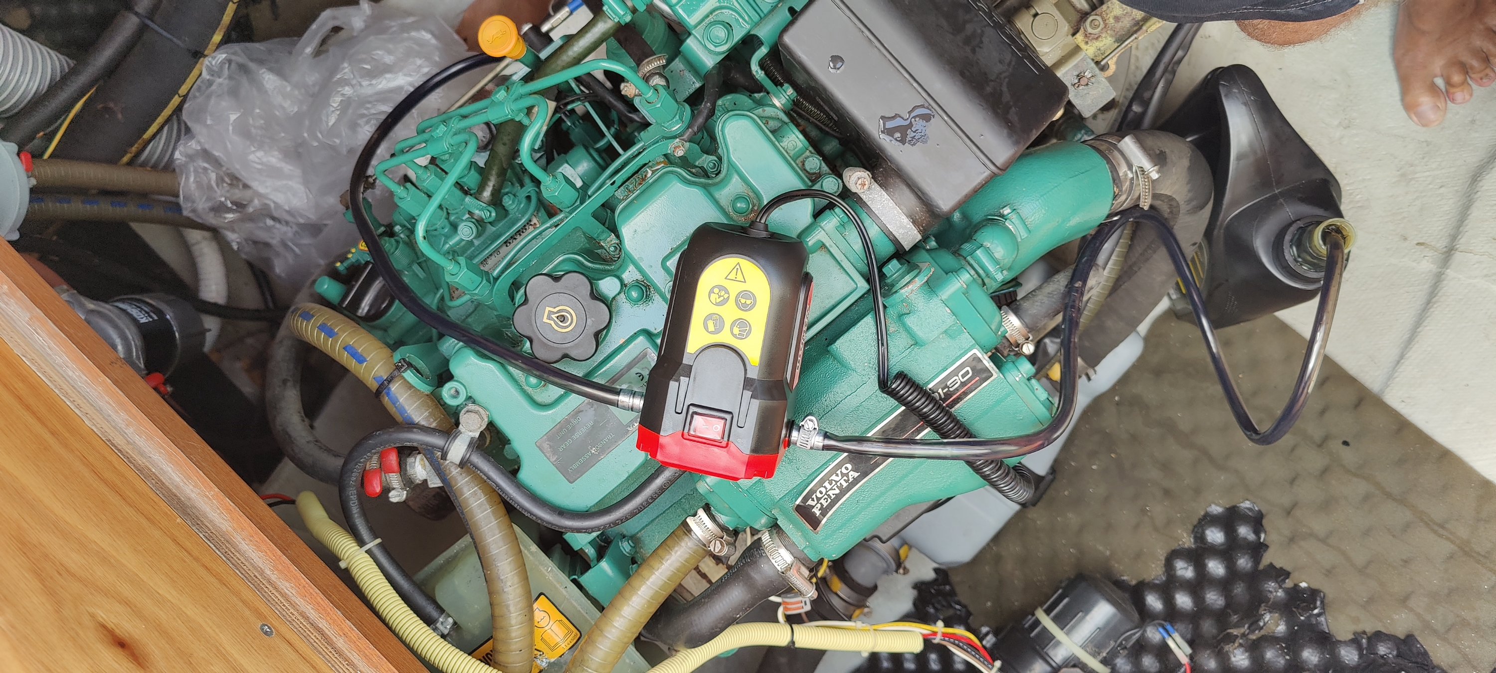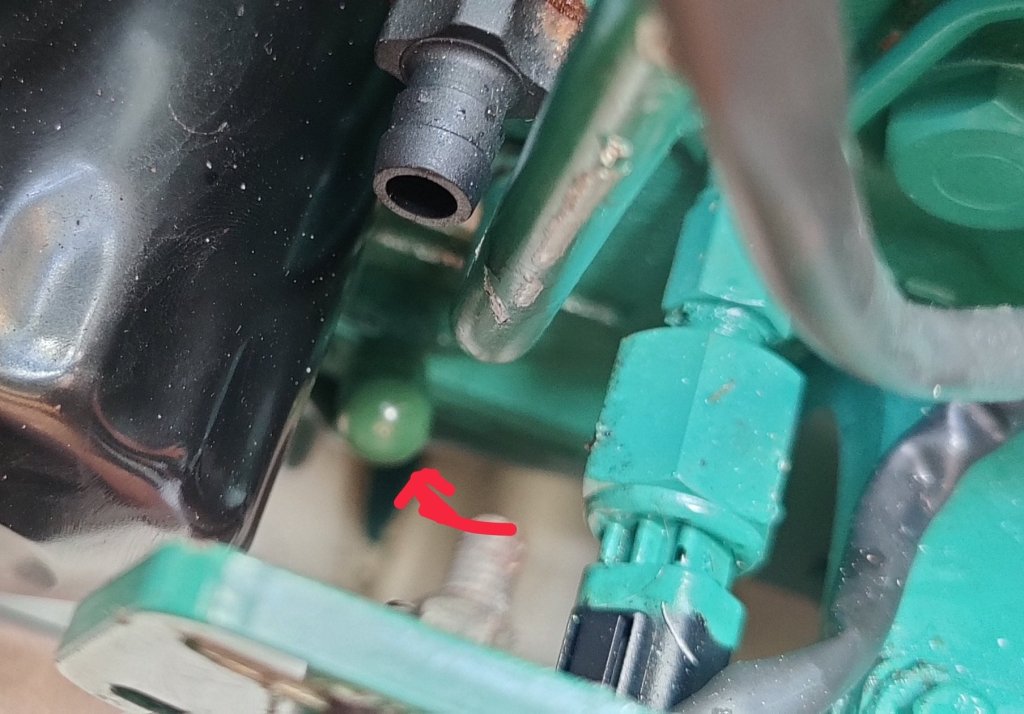 Bislang habe ich das warme Öl mit einem Vakuumsauger durch den Peilstab abgesaugt. Dauert lang und ist mühsam. Volvo hat unten an der Ölwanne extra ein Rohr angeschlossen, das nur mit einem Gummistopfen abgedeckt ist.