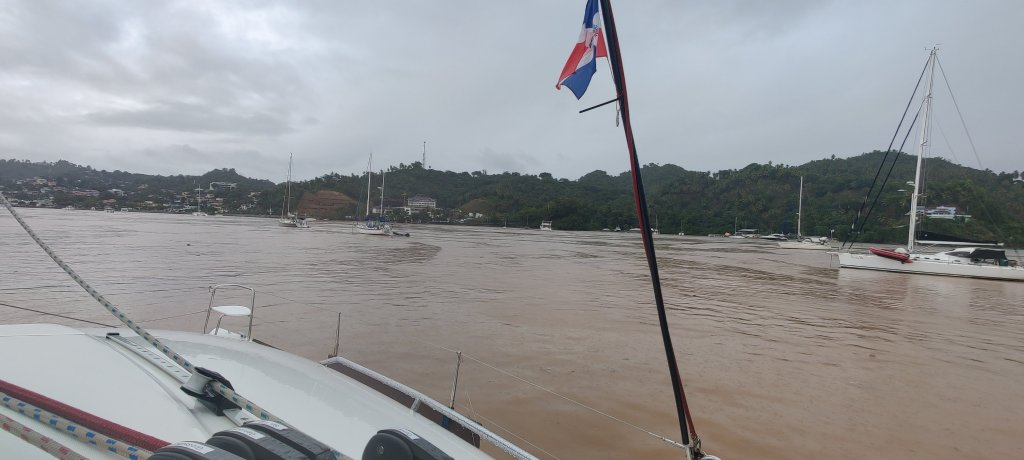 Was aber krass ist, ist das Wetter. Es gibt seit einer Woche täglich lang andauernde Regengüsse. Mehr so wie letztes Jahr im Ahrtal. Der Ort wird von Schlamm-Massen überschwemmt und alles geht in die Bucht. Wohin auch sonst? Das Wasser verfärbt sich braun und es treibt kräftig Müll auf der Oberfläche.