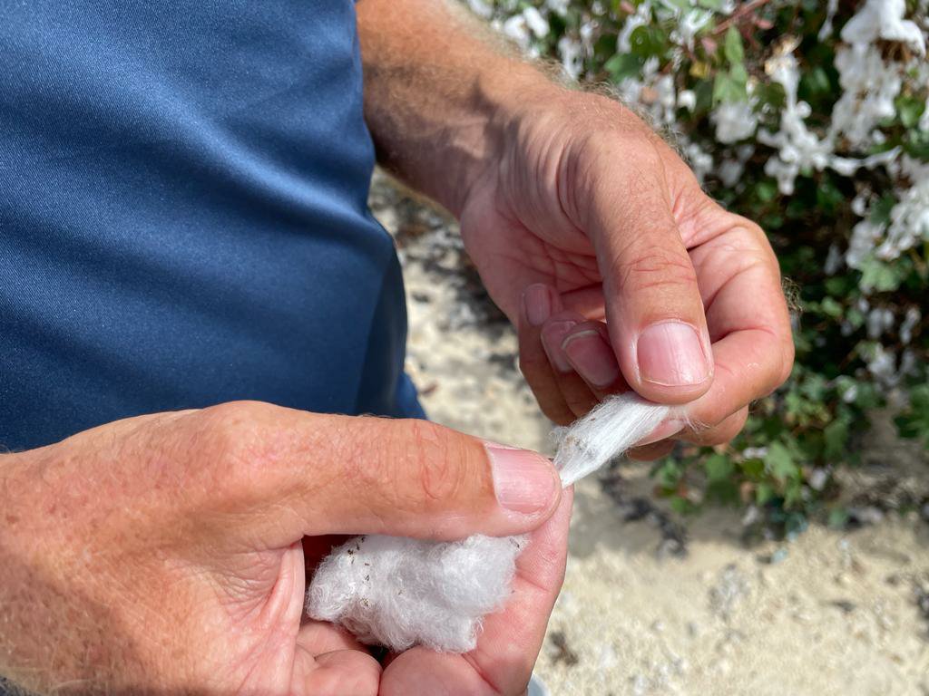 Unterwegs kommen wir an reifen Baumwollpflanzen vorbei und ich kann wieder herrlich darüber dozieren. Keine Beschwerde kommt. Sabine spinnt per Hand ein Fädchen. Back to the roots!