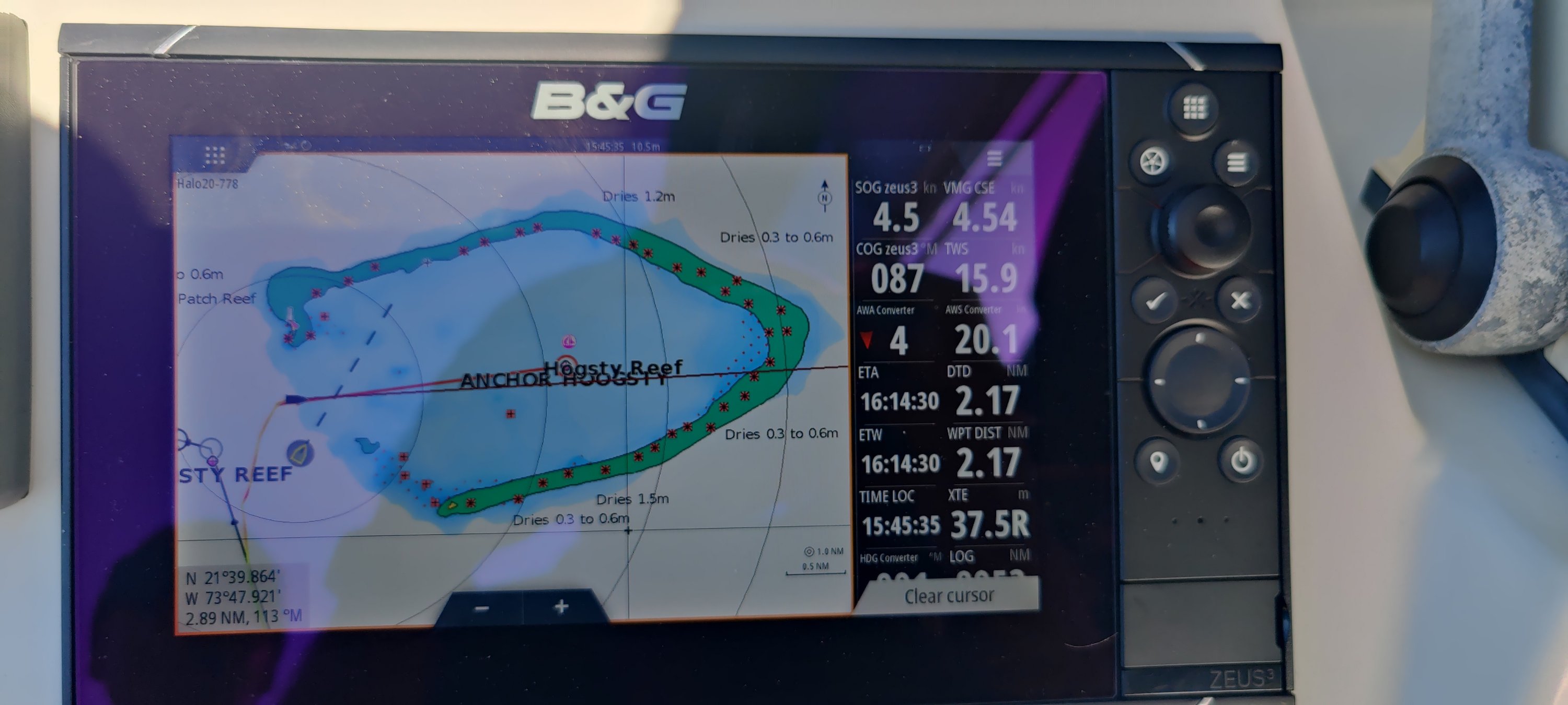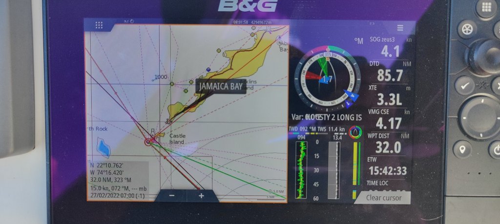 Wir sind mit Groß und Genua unterwegs. Um 15 Uhr sollten wir dort ankommen. Dann geht es scharf rechts in die Jamaika Bay, eine erste geschützte Bucht von Acklins Island.