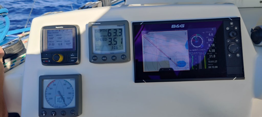 Aber fangen wir positiv an. Am Samstagmorgen lachte die Sonne und mit ihr ein schöner östlicher Wind mit 15 – 18 kn. Ideal! Also das Schnorcheln abgesagt und für 10 Uhr Abfahrt vereinbart. Anker auf, Segel im ersten Reff und los.
