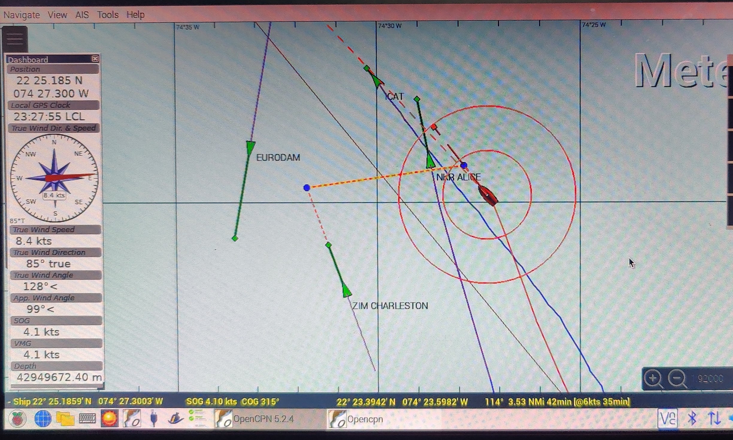 Aber irgendwie ist nachts immer was los. Natürlich sind wir auf einmal im Fokus von vier großen Schiffen. Zwei Containerfrachter und ein großes Cruiser-Ship und eine kleine Megayacht. Auf OpenCPM (einer freien Navigationssoftware!) sieht man, das wird eng.