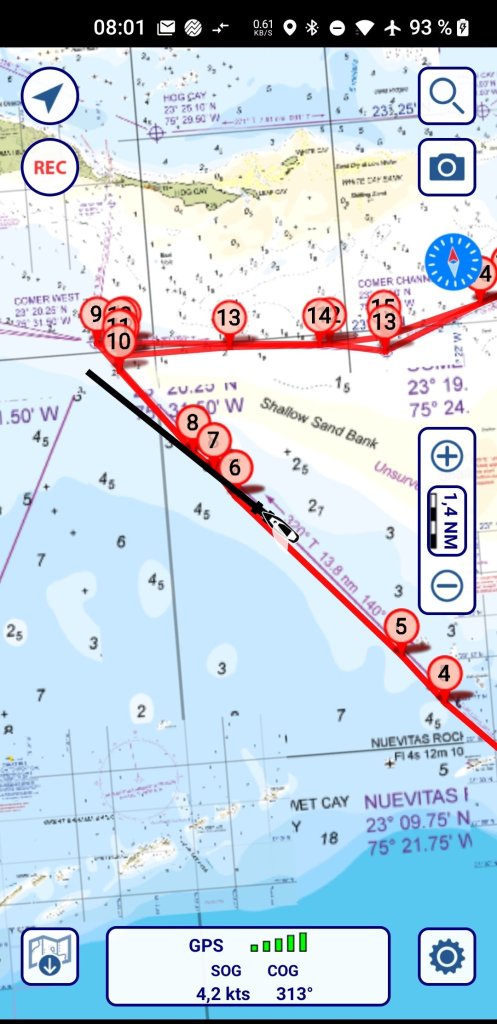 Das ist dann noch mal was für den Pulsschlag. Mit voller Besegelung, hoch am Wind durch 4 bis 2,5 Meter tiefes Wasser. Wir vertrauen auf Impfen und gute Seekarten. Und der Autopilot folgt extrem genau dem geplanten Weg. Ich könnte es von Hand nicht so genau!