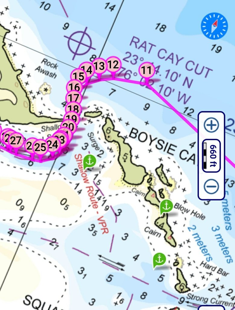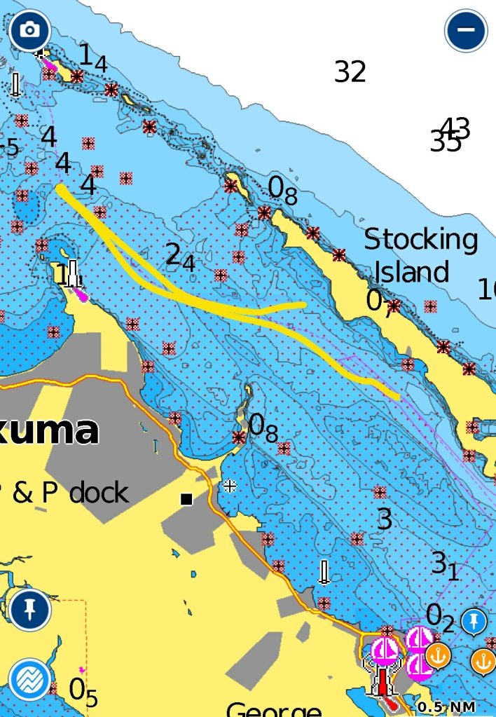Man sieht, die modernen, genauen Seekarten haben das Leben für Cruiser wesentlich erleichtert. Die Einfahrt in den Cut, so nennen die hier die Pässe, war dann noch spannend. Es gab kräftig Gegenströmung, aber unsere Baradal hat es top gemeistert und den Captain hat’s gefreut. Wir sind dann sehr spektakulär einen engen Weg entlang der Inseln gefahren.