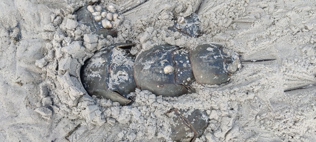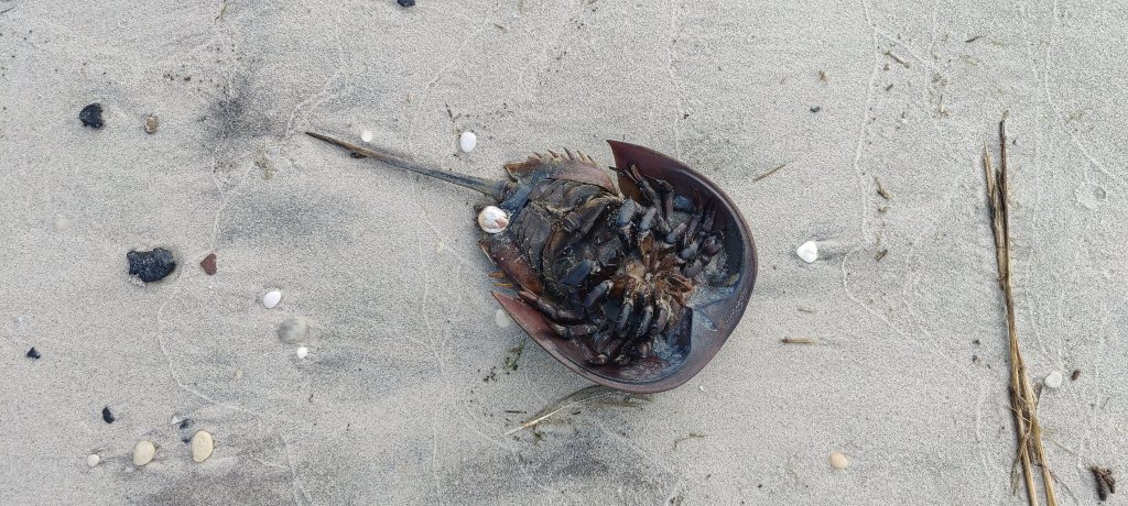 Das sind ‚Horseshoe Crabs‘. Sehr speziell. Sie hätten blaues Blut (wirklich wahr, im Gegensatz zu den Royals und so). Das würde für die Medizin genutzt und sei sehr wichtig. Hier kämen sie zur Eiablage.