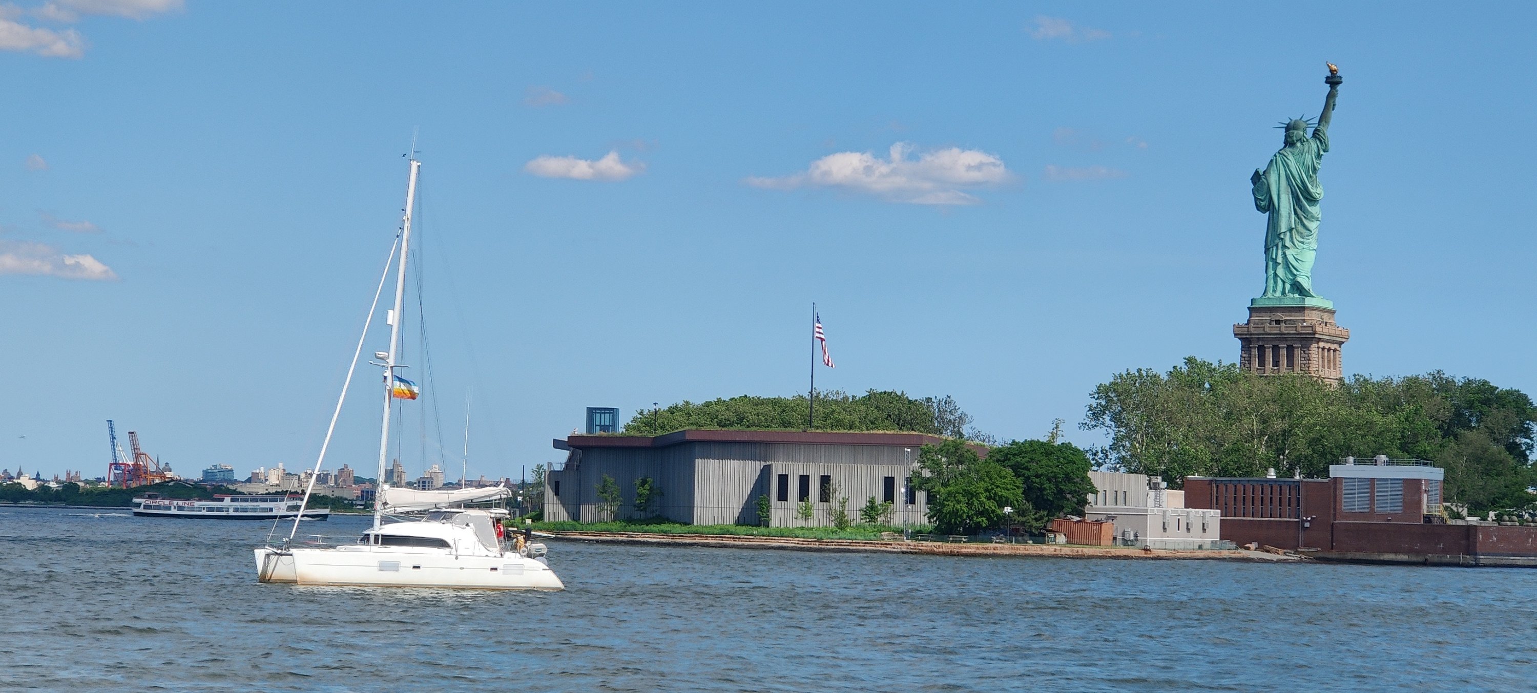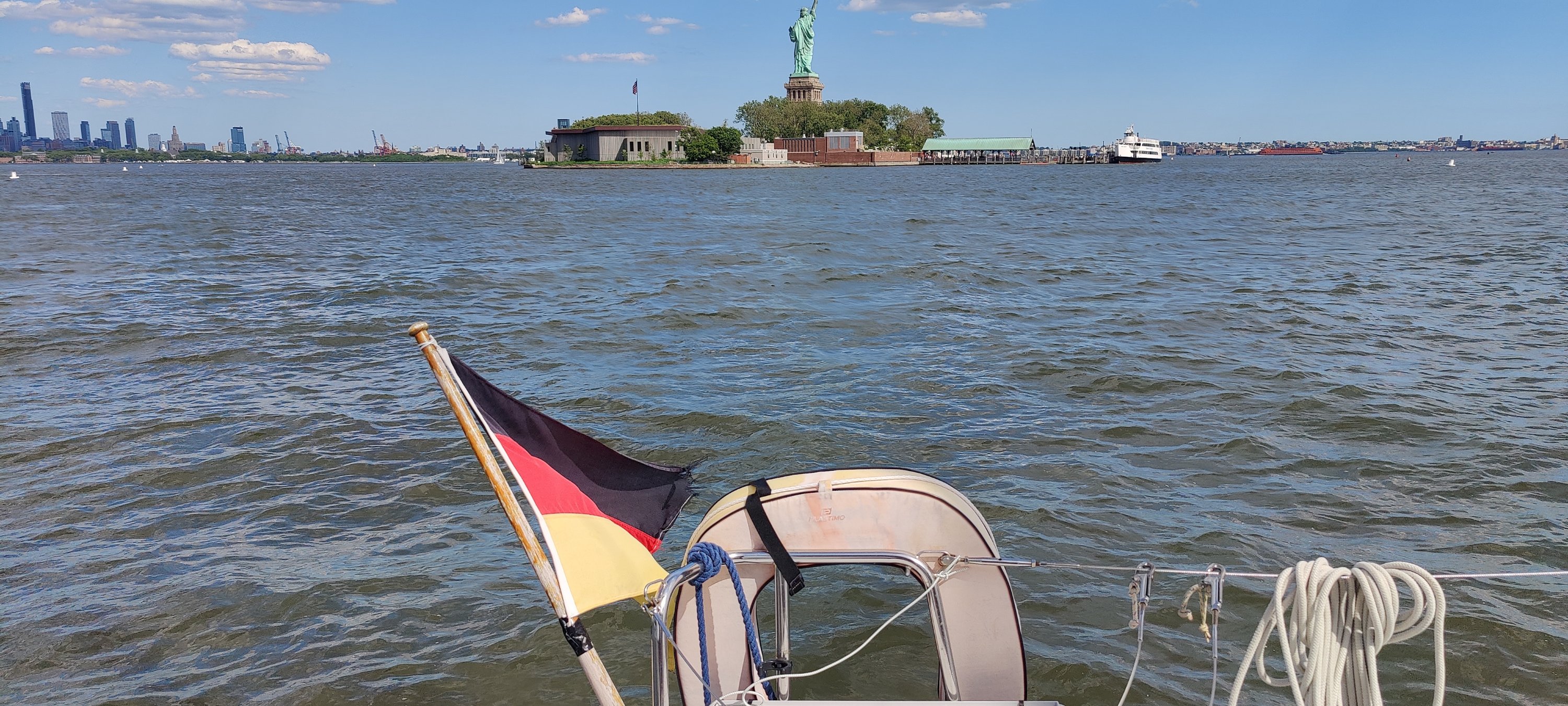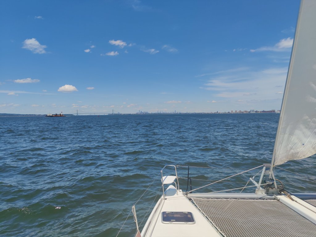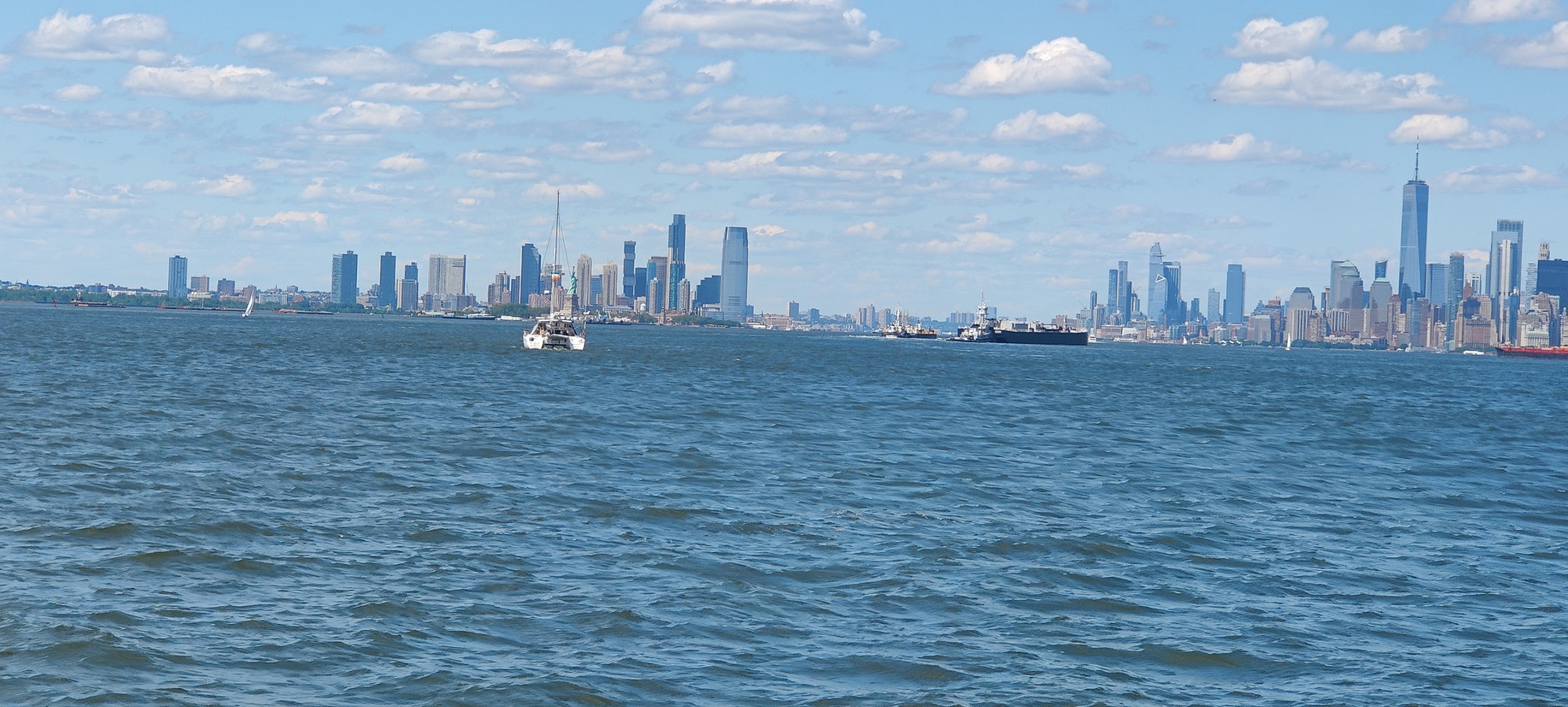 Die Fahrt von Sandy Hook haben wir gut geplant. Wetter und Strömung wollen beachtet werden. Das Wetter war sonnig und ein leichter SüdWest Wind vorher gesagt, also passt alles. Die Strömung ist, wenn wir um ca. 13:00 Uhr abfahren an der Engstelle, also der Verrazano-Narrows Brücke mit uns und schiebt uns durch. Da hier doch recht viel Schiffsverkehr ist, sind gute Fahrtbedingungen recht willkommen. Ein paar Schubverbände und Fähren erfordern Aufmerksamkeit. Die fahren durch, egal was kommt. Zur Not funken sie einen an und scheuchen einen aus der Kurslinie.