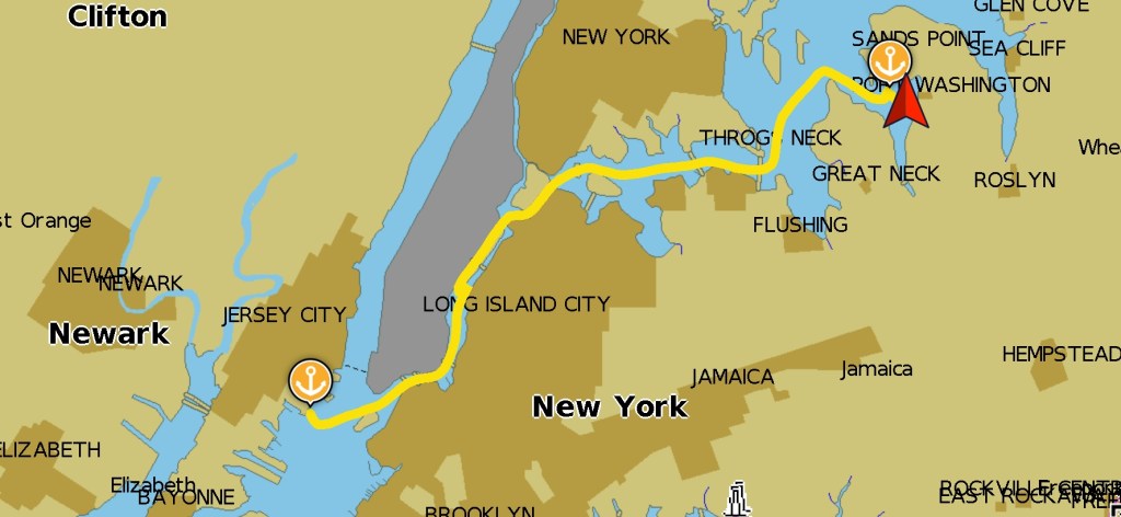 Da oben sieht man die Strecke durch New York zu unserem Mooring- (Anker)platz bei Port Washington. Wir haben diese Bucht aus mehreren Gründen gewählt: