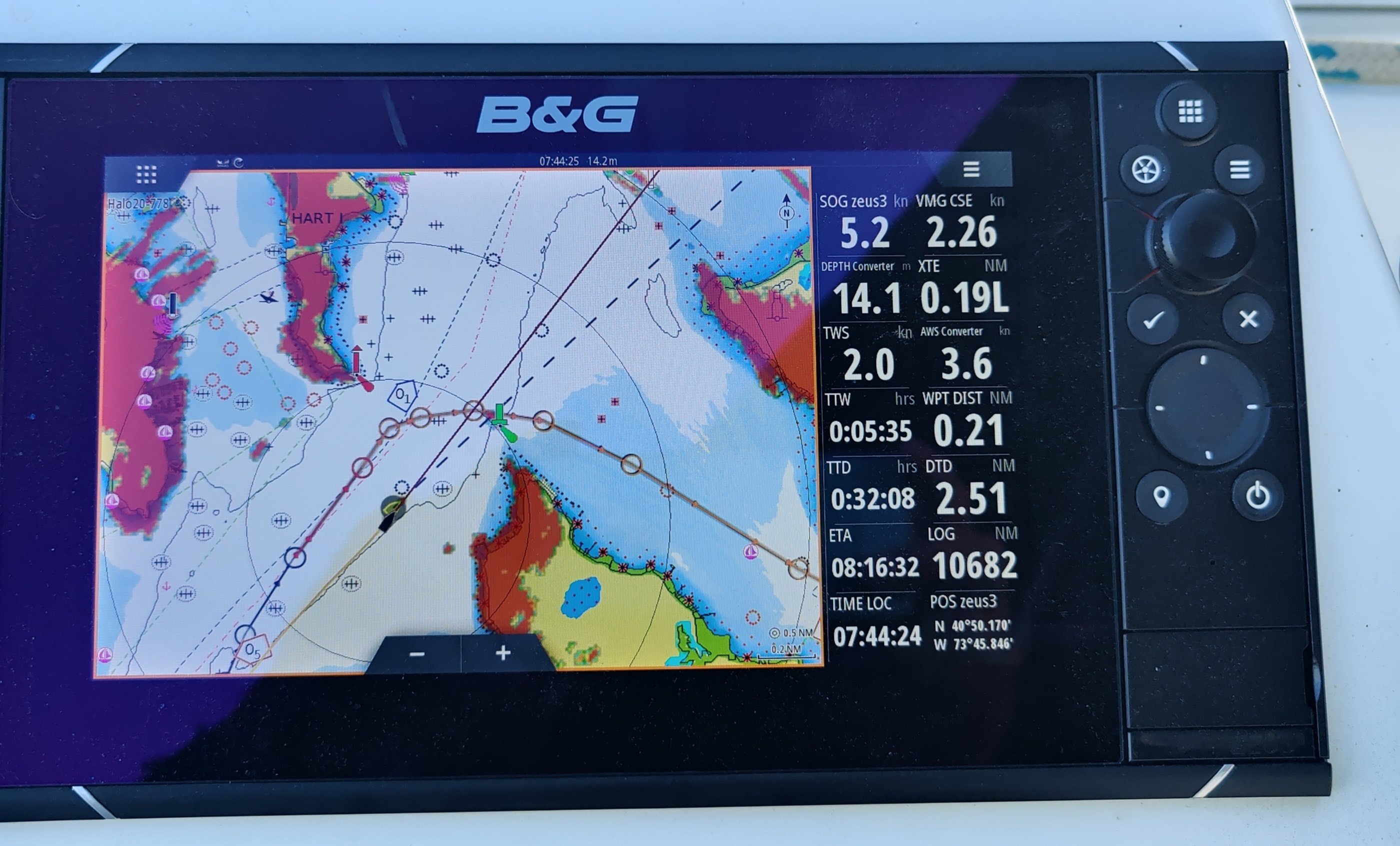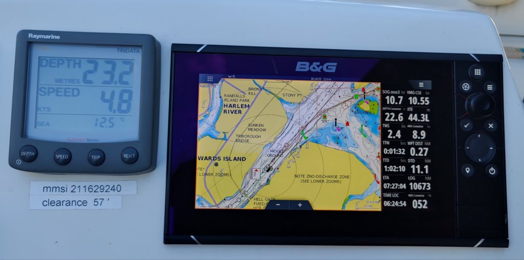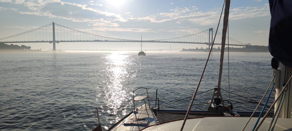 Der anfängliche Dunst zieht sich immer weiter zu. Wassertemperatur 9⁰C, kein Wind, da geht was. Leider sind die Angler und Fischer hier recht Hardcore. Auch bei diesem Wetter wird geangelt. Die Boote siehst du im Nebel nicht. Ohne irgendwelche Beleuchtung oder laute Musik. Aber das Radar hilft da sehr. Die Angler erscheinen, wie auch die Seezeichen, als rote Punkte auf der Karte. Da passen wir auf und halten bei Bedarf Abstand. Wenn dann so ein imposantes, altes Seezeichen im Nebel an der erwarteten Stelle auftaucht, ist das klasse. Es funktioniert gut mit dem Radar. Wir sind aber jetzt auch recht langsam unterwegs. Der New York LaGuardia Airport liegt jetzt rechts hinter uns, die Flieger landen im Sekundentakt, das Business dreht seine Runden.