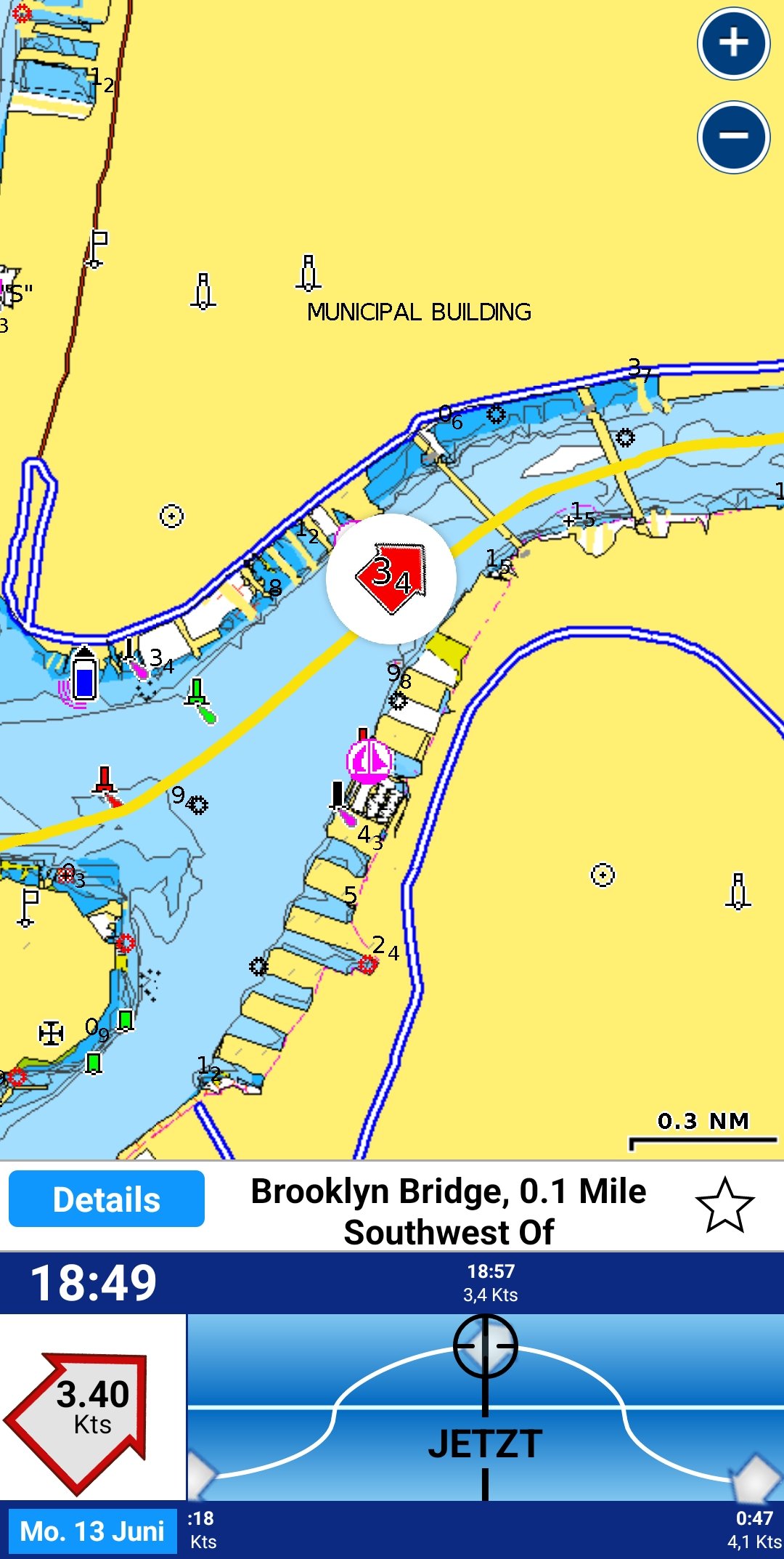 Gut, und was ist der Plan für heute? Nach Port Washington in der Mitte von Long Island soll es über den East River gehen. Hier wirken sich Ebbe und Flut stark aus. Heute sieht es mit den Gezeiten so aus: