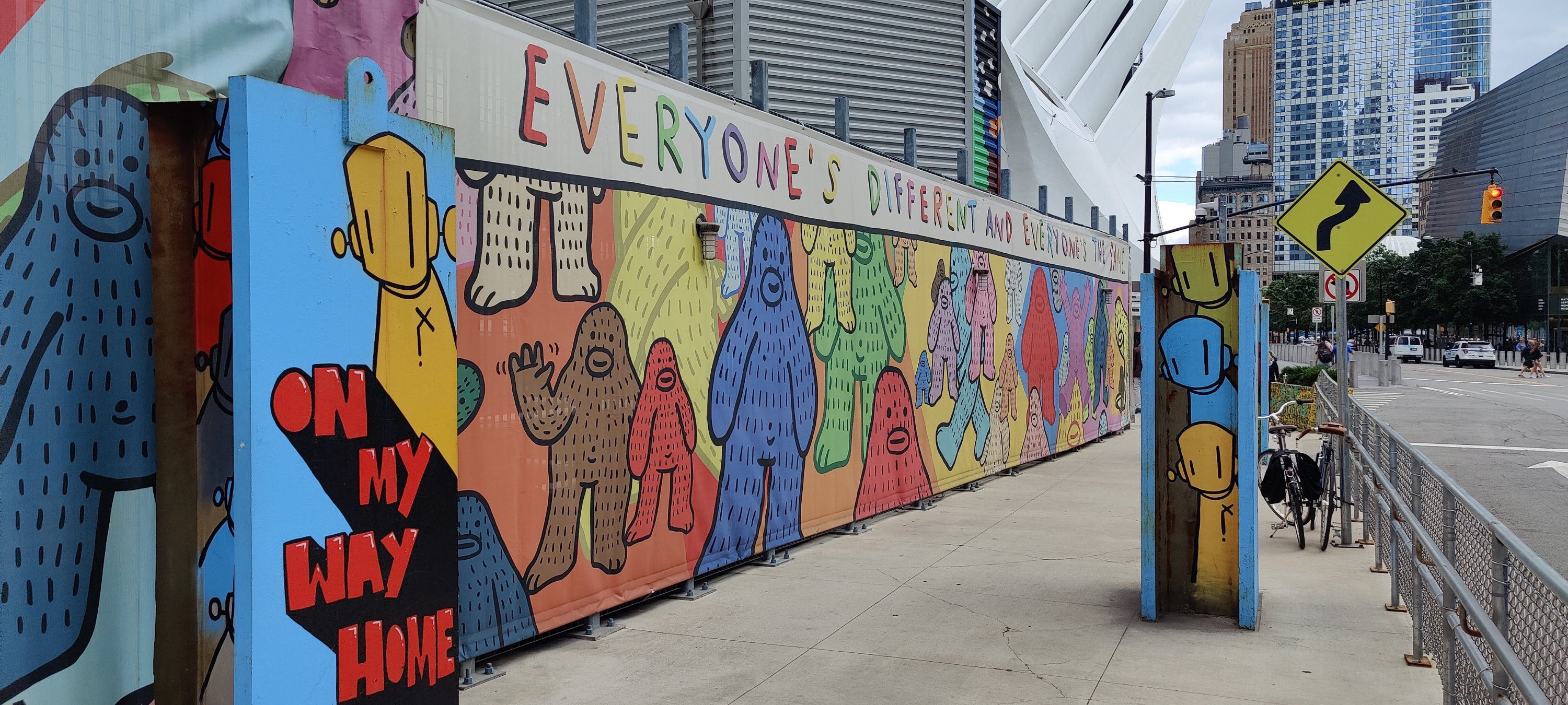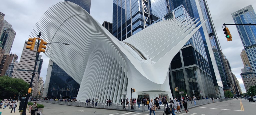 Wieder unten hört das Staunen nicht auf. Der Oculus direkt am 9/11 Memorial ist eine U-Bahnstation und Einkaufsmeile, welche oberhalb der Erde ein grätenartiges Dach hat. Faszinierend.