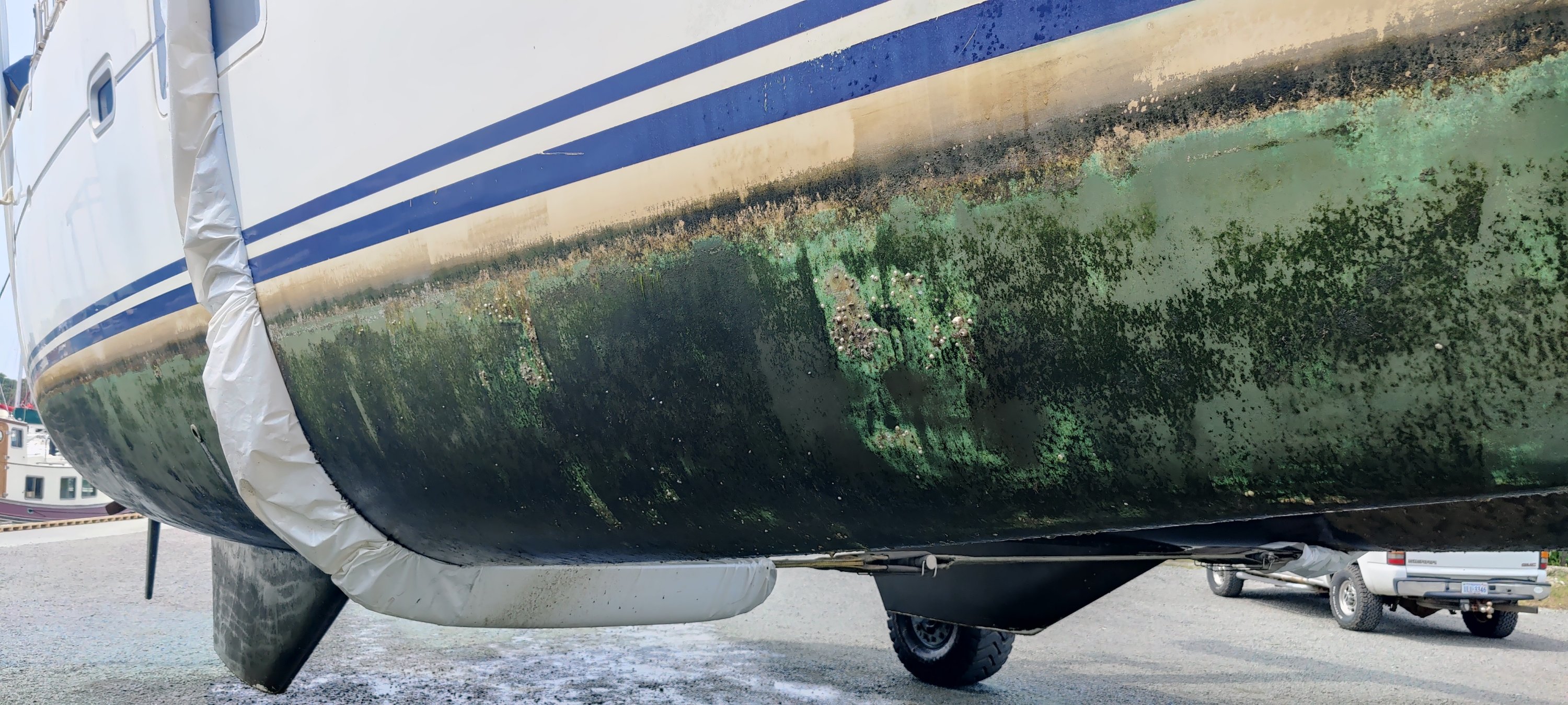Was steht noch an Arbeiten an? Der Rumpf ist perfekt geputzt. Es gibt ein Zaubermittel (🧐) bestehend aus Salzsäure, Phosphorsäure, Oxalsäure und noch ein paar mehr Mittelchen. Damit feudelt man den Rumpf ein, wartet ein paar Sekunden, schrubbt ggf. noch an schwierigen Stellen und spült alles mit einem kräftigen Wasserstrahl ab. Schon ist das Braune weg, der Rost verschwindet und das strahlende Weiß kehrt zurück. Sensationell. Bei uns in Europa sicher bei 10 Jahren Sozialarbeit strafrechtlich bewehrt. Egal, es funktioniert und Alternativen dazu gibt es kaum.