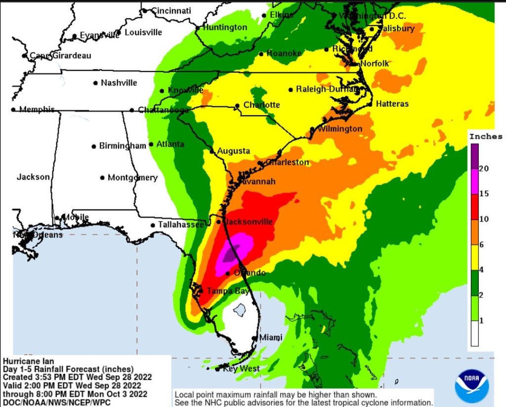 Seit Montag werden die Warnungen immer deutlicher: Es ist mit Gewitterstürmen und starken Niederschlägen auch hier in Deltaville zu rechnen. Noch weiß keiner, welche Bahn der Sturm nehmen wird, aber wir sind wahrscheinlich von den Ausläufern betroffen. In Florida sind Millionen auf der Flucht, die Überschwemmungen sind enorm. Von Freitag bis Dienstag ist auch bei uns heftiger Regen zu erwarten. Nun, ein Boot sollte da nicht die schlechteste Wahl sein.