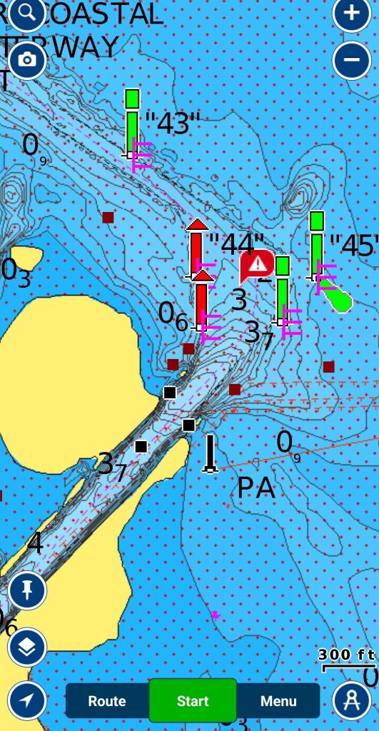 Kurz vor dem Ziel mussten wir vom Außenbereich scharf rechts in einen Kanal abbiegen und dann durch eine Klappbrücke in den letzten Abschnitt vor Titusville einbiegen. Die Karte zeigt, dass es zwischen zwei Inselchen durchgeht.