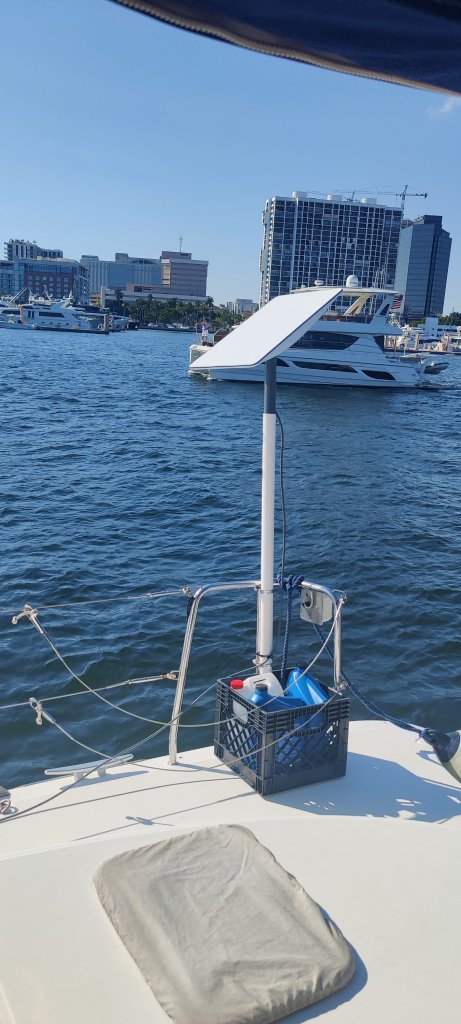 Ich bin jedenfalls schwer beeindruckt. Wenn ich an die erste Montage einer Astra-Schüssel in Aachen zurück denke, ist es schon sensationell was sich da entwickelt hat! Damals war das Aufstellen und Feinjustieren echt ein Thema. Mal sehen, wie es auf den Bahamas und in der Karibik funktioniert. Ein Projekt kommt noch: Das ist die Montage auf einem Rohr an der Reling. Das ist etwas eleganter und die Schüssel hat einen festen Platz. Und falls ich Langeweile habe, baue ich das ganze Ding von 230 V auf 12V um. Die notwendigen Teile sind bereits an Bord.