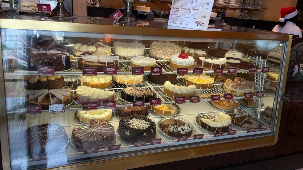 Ja, und wenn man dann mal Hunger hat, da gibt es jede Menge Auswahl. Am Square ist die „Cheese Factory“ ein tolles Café und Restaurant. CheeseCake haben wir mit Käsekuchen unzureichend übersetzt. Es sind Torten, die unsere deutschen Cremetorten als Diätlebensmittel abgrenzen. In der Karte ist dementsprechend kein Preis, sondern die Kalorienzahl aufgeführt. Ich denke die Angaben sind geschönt!!!😀
