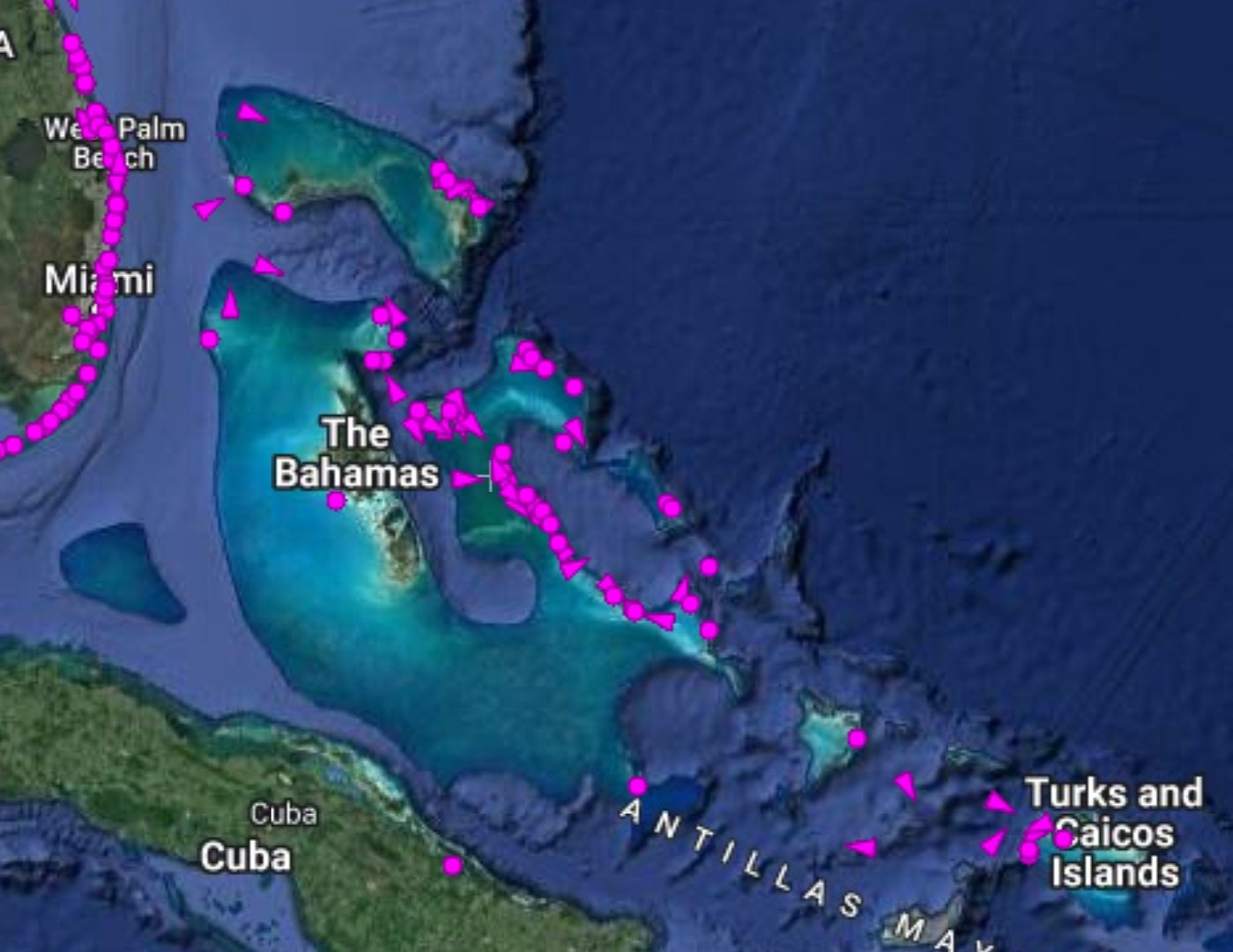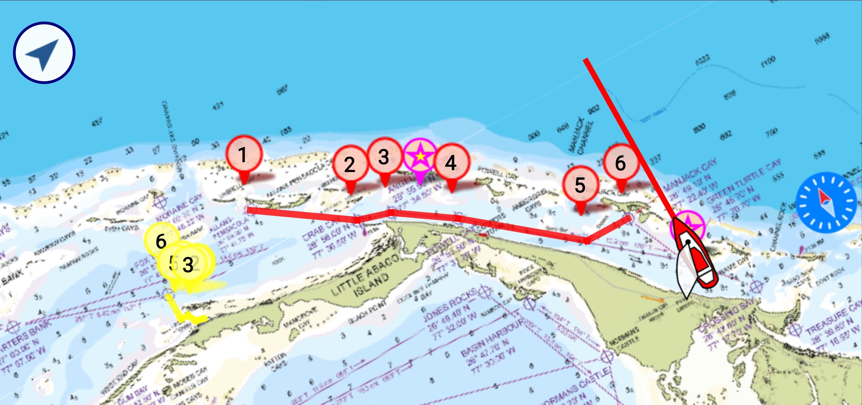 Das Navigieren in den flachen Gewässern der Bahamas erfordert Umsicht! Oftmals empfiehlt es sich, genau den bewährten Routen zu folgen. Dazu fährt man von Fixpunkt zu Fixpunkt. Diese Fixpunkte sind in Karten verzeichnet. Die Aktualität der Karten ist hier im Hurrikan Zentrum der Karibik nicht zu unterschätzen. Wir haben deshalb die „Explorer Charts“ benutzt. Diese sind sehr aktuell, genau und kostenpflichtig! Günstig und leicht handhabbar sind diese in der App “ Aqua Map Marine“ als Download auf dem Handy oder Tablet zu installieren. Der Export als .gpx-files auf den Plotter ist dann sehr angenehm.