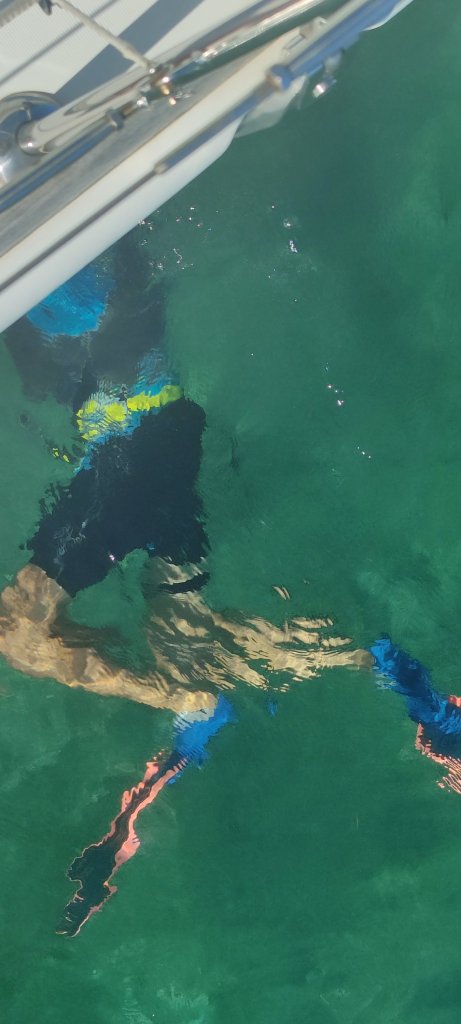 Was total erfreulich ist: Das teure Propspeed, ein spezieller Lack für den Propeller, der Muschelbewuchs verhindern soll, funktioniert super. Blitz sauber! Aber an einem Propeller fehlten zwei der drei Opferanoden. Schnell wieder neue angeschraubt. 👍 Soviel dann zum technischen Krempel einer Langfahrt⛵