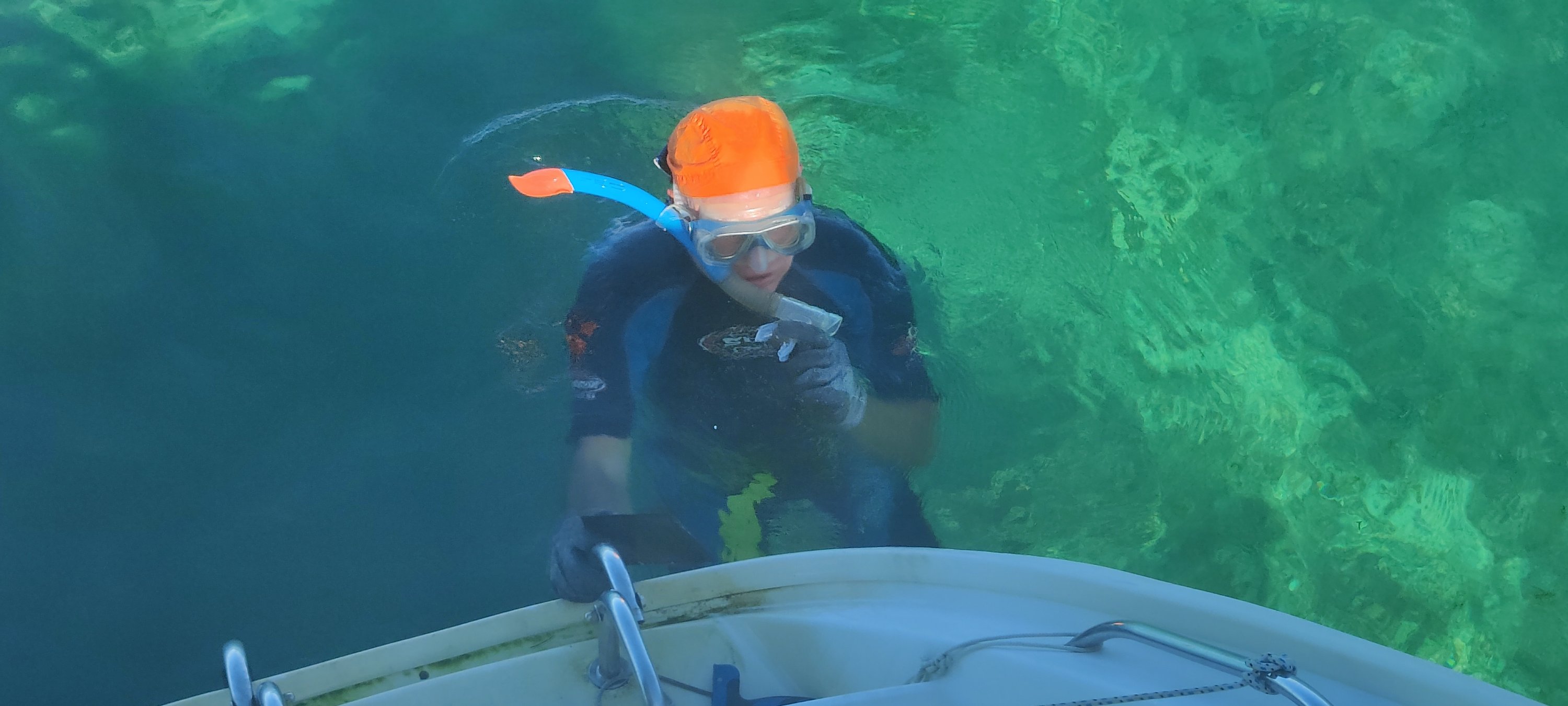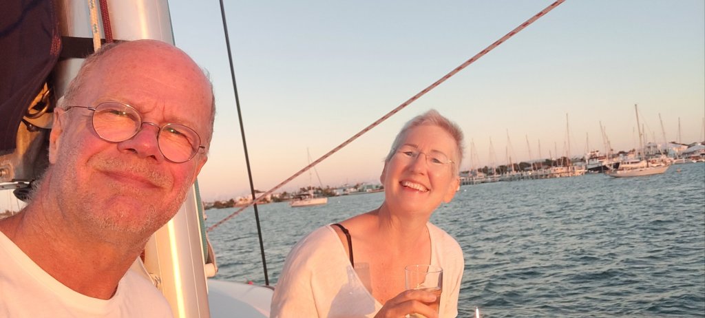Unser nächster Stopp war ‚Green Turtle Cay‘. Dort stand Putzen an. Nein, nicht wie üblich Wohnbereich und Besatzung, sondern der Unterwasserbereich der Rümpfe. Dort hatten wir in Deltaville das Copper Coat erneuert. Um es gleich zu sagen, die Monate im Brackwasser haben doch einigen der kleinen Muscheln (Barnacles genannt) ermöglicht, sich am Rumpf anzusiedeln. Nicht viel, aber das muss nicht sein. Also rückt der Skipper, gut geschützt gegen Kälte und Sonne, dazu mit Handschuhen, Flossen und Schnorchel, dem Ungemach mit einem breiten Edelstahlspachtel zu Leibe. Das ist mit etwas Erfahrung schnell erledigt. Nach 2 Stunden war es geschafft.