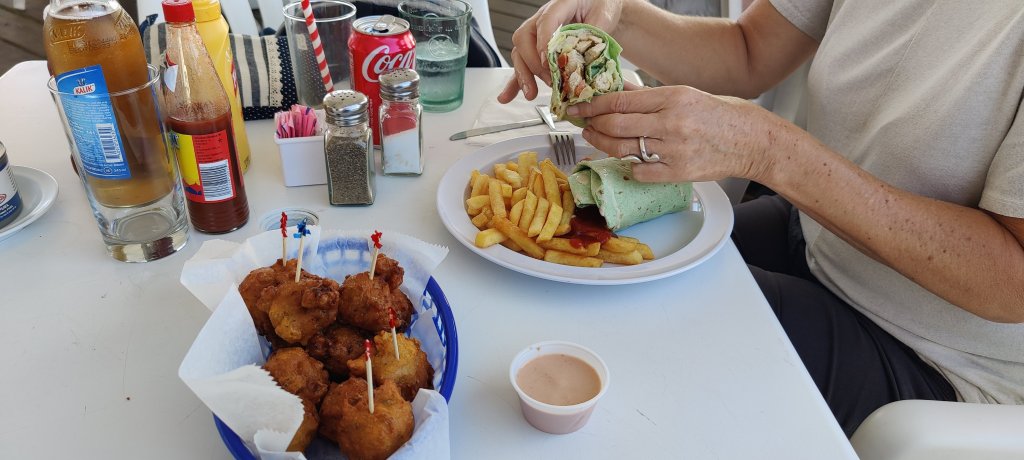 Ok, Treppensteigen macht durstig und hungrig. Also fahren wir einen Steg weiter. Denn einen Fußweg gibt es nicht, zu Capt’n Jack, dem Restaurant am Ort.