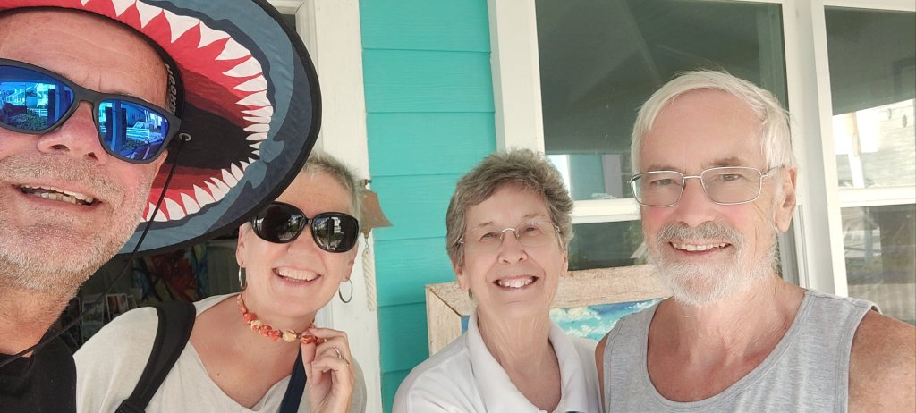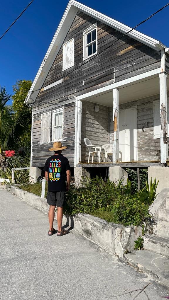 Und danach? Ach ja, „ich höre Deutsch“, (Damit schließt sich der Kreis). Wir schlendern durch den Ort und ich soll mich mit dem Shirt ‚Alles wird gut‘ vor einer Bruchbude postieren. Die Regieanweisung hört Anne, die auf der Terrasse der Art Gallery sitzt. Wir kommen ins Gespräch. Hermann und Anne sind Deutsche, die hier seit vielen Jahren den deutschen Winter vergessen lassen. Wir erfahren viel von der Katastrophe 2019, als Dorian ganz Hope Town dem Erdboden gleich machte. Was wir nicht wussten, dass das Meer hier die Inseln komplett überspült hat und deshalb auch so viele Bäume abgestorben sind. Das Salzwasser hat alles zerstört! Der Wiederaufbau dauerte lange, war teuer und nervenaufreibend. Hermann ist noch tief gezeichnet von der schrecklichen Erfahrung. Das Haus ist seit den 70ern im Besitz der Familie. Da hängt das Herz dran. Aber Anne bringt etwas amerikanische Zuversicht in das Team und so wird das schon werden. Es braucht halt Zeit bis die inneren Wunden verheilen. Hermann malt schöne Bilder, die er an Touristen verkauft.