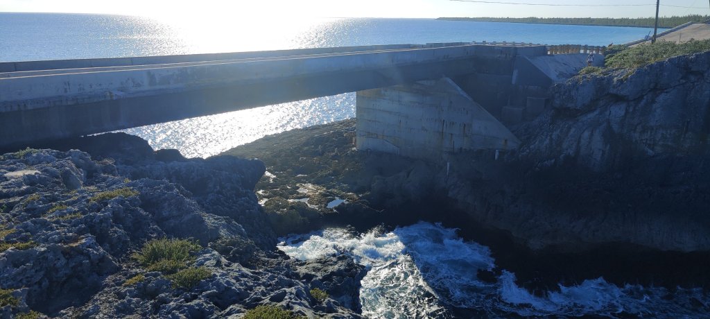 Zuerst ging es runter zum Current Cut. Das ist ein schmaler Einschnitt zwischen Current Island und Eleuthera. Der Name ist Programm! Dort strömt zwischen Ebbe und Flut mächtig das Wasser durch. Brigitte gab die Devise aus: eine halbe Stunde nach dem Höchststand Anker auf zu gehen und das war gut so. Früh gegen 9:30 Uhr sind wir durch. Die Strömung war kräftig, aber nicht schwierig. Immer wieder so ein Kribbeln, wenn so enge oder schwierige Passagen anstehen. Wir sind dann links zum Glass Window abgebogen. Das ist eine Brücke über einem Einschnitt in der schmalen Insel. Toller Blick hindurch.
