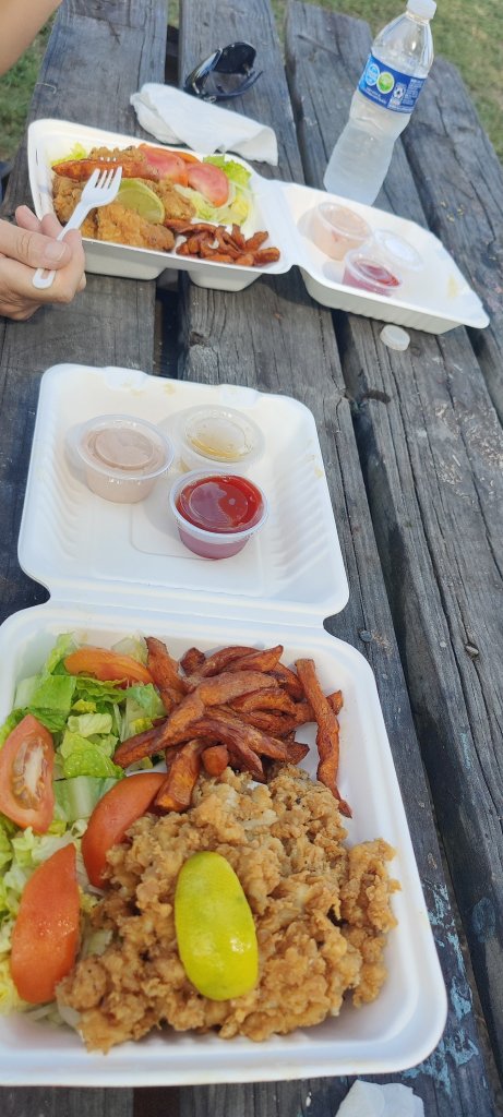 Am Sonntag wollten wir wieder essen gehen, aber alle Restaurants in Rock Sound sind Sonntags geschlossen! Lediglich eine Pizza Bude hatte keine restriktiven Infos auf Google Map verkündet. Wir haben uns durch die Mittagshitze auf den Weg gemacht. Vor der bescheidenen Hütte parkte ein Truck (LKW), dessen Fahrer sich gerade etwas zum Essen geholt hatte. Gutes Zeichen! Wir rein und die nette ältere Dame erklärte uns, dass es heute keine Pizza gibt, aber Conch fries und Grouper (Barsch) mit Salat und Pommes, eine Verlockung. Das Ergebnis war hervorragend! Echt lecker. Gegessen haben wir im Schatten unter einem Baum. Da stand eine Bank mit Tisch. Was will man mehr.