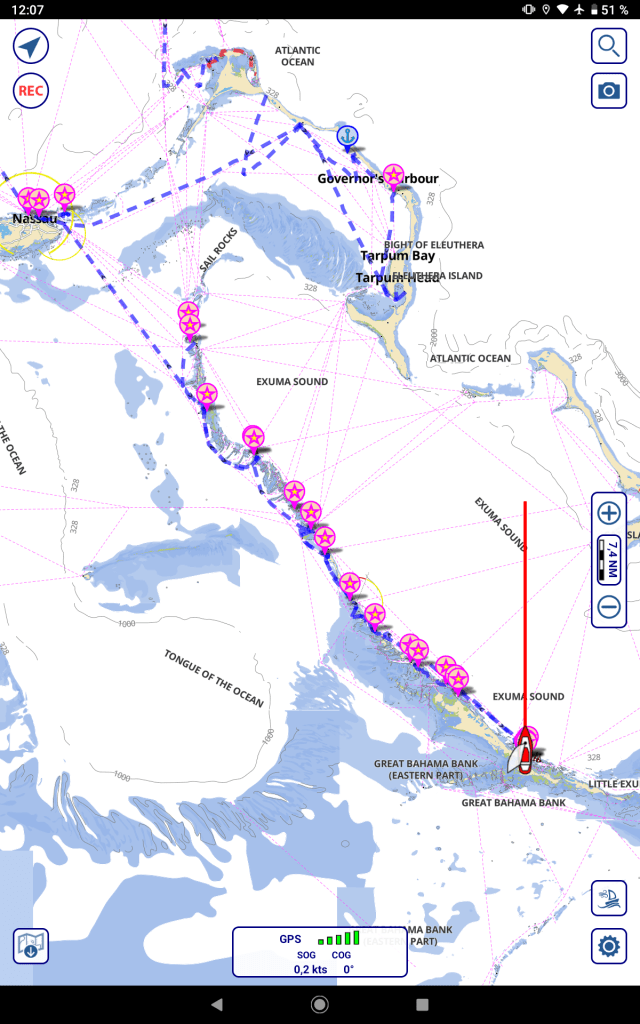 Mit der neuen Genua und dem ruhigen Wasser macht es Spaß, auch mal hart am Wind oder gegen den Wind zu kreuzen. Vor Eleuthera (Iluthra sagen die Amis) gibt es eine riesige flache (5m) Wasserfläche. Da geht was!