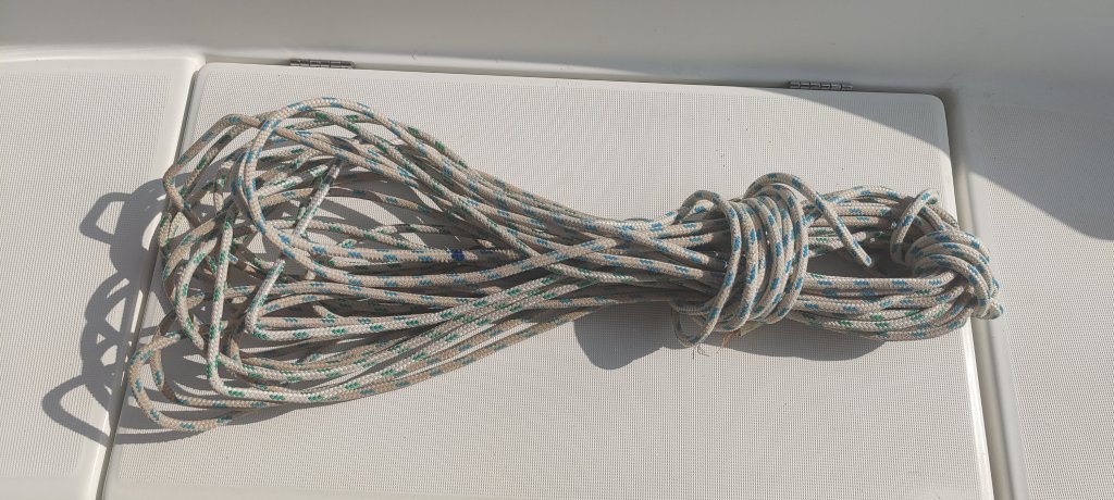 Die jüngste Service-Aktion im Norden der Abacos war das Auswechseln der ‚Dirk‘. Das ist das Seil, welches den Baum mit samt dem Segel, wenn man nicht segelt, am Runterfallen hindert. Also sehr wichtig. Zum Glück haben wir ausreichend Ersatz-Leinen an Bord🍀.