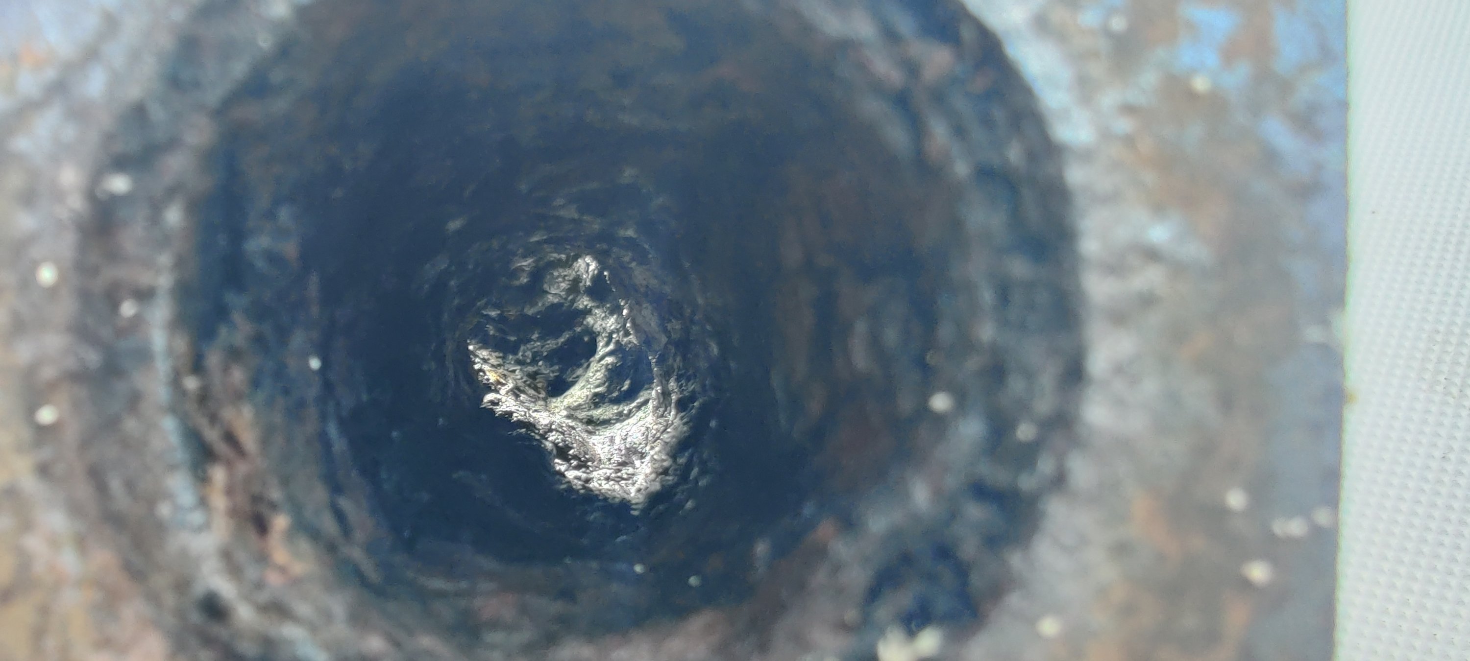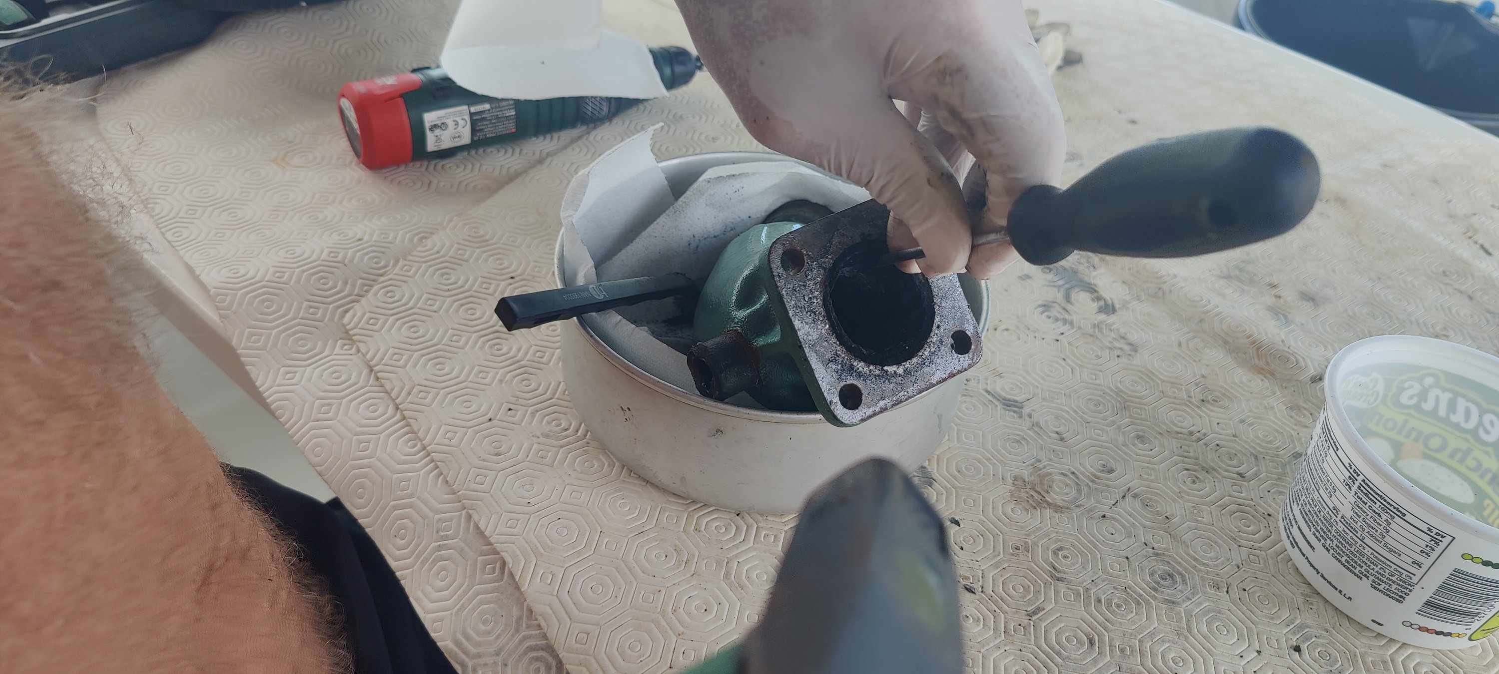Also vor Anker und dann nach der Ursache gesucht. Die einschlägige Literatur sagt: zuviel Diesel und zu wenig Luft. Kann nur der verstopfte Auspuffkrümmer oder der verschmutzte Luftfilter oder beides sein.