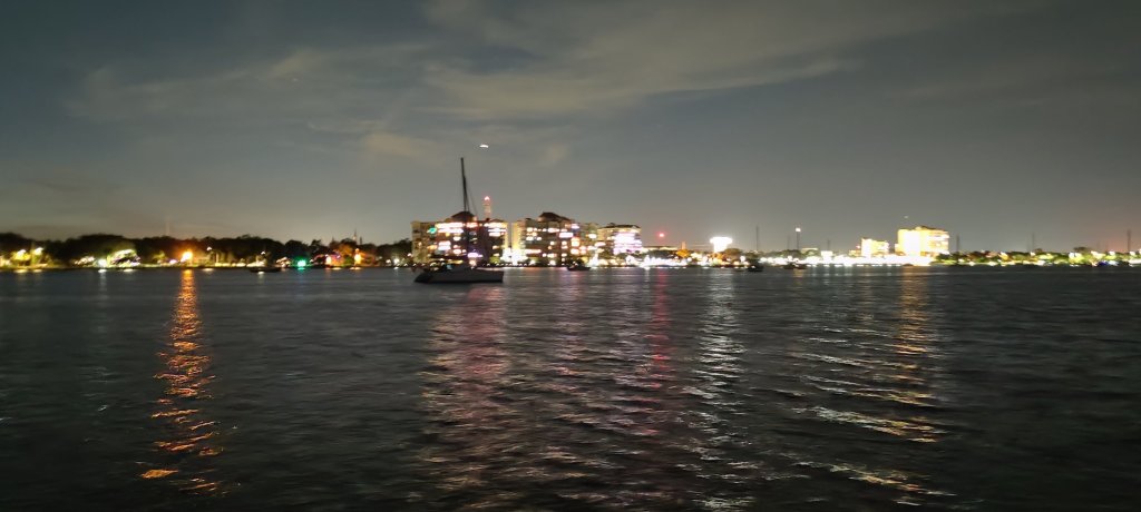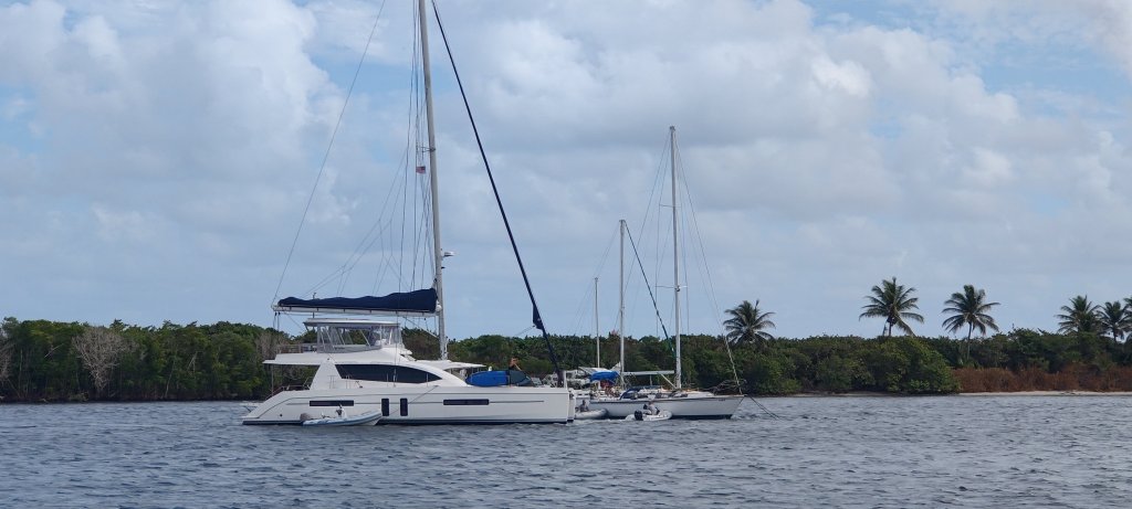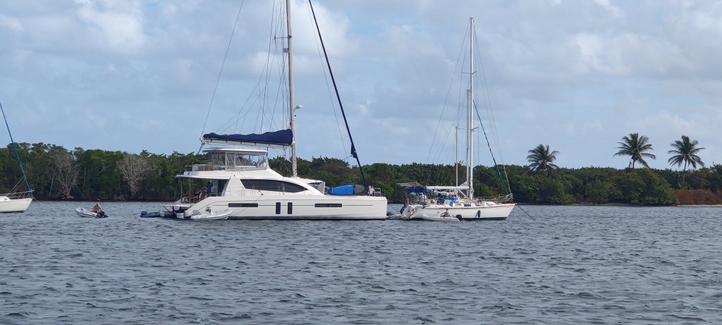 Wir liegen jetzt 25 nm vor Palm Beach im Peck Lake, einer Ausbuchtung des ICW. Bei Gegenwind und Gegenströmung, ergänzt um viele Motorboote (Sonntag) auf dem ICW unterwegs, fanden wir das einen geeigneten Zwischenstopp. Da wird plötzlich über Funk der Coastguard gemeldet, „ein riesiger Katamaran driftet unbemannt und treibt auf ein anderes Segelboot“. Die Ortsangabe ist direkt in unserer Nähe. Nach einiger Zeit kommt ein Schlepper von BoatUS (quasi der ADAC auf dem Wasser) schaut sich um und fährt wieder weg. Wir gucken genauer und tatsächlich, da verhaken sich ein Segelboot und ein Katamaran. Da ein Boot nicht gegen Wind und Strömung driften kann, ist schnell klar, das Segelboot hat amerikanisch geankert und rutscht langsam weiter. Keiner an Bord. Da kommen die Eigner des Kat. Mit Hilfe mehrer Dinghys wird das Gewusel geklärt. Zum Glück rechtzeitig und nix passiert. 🍀