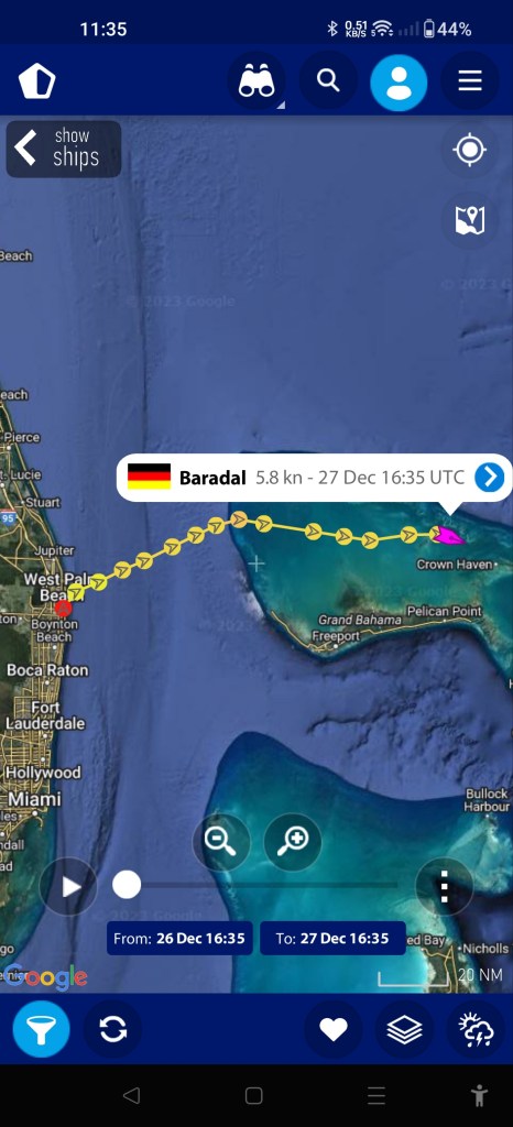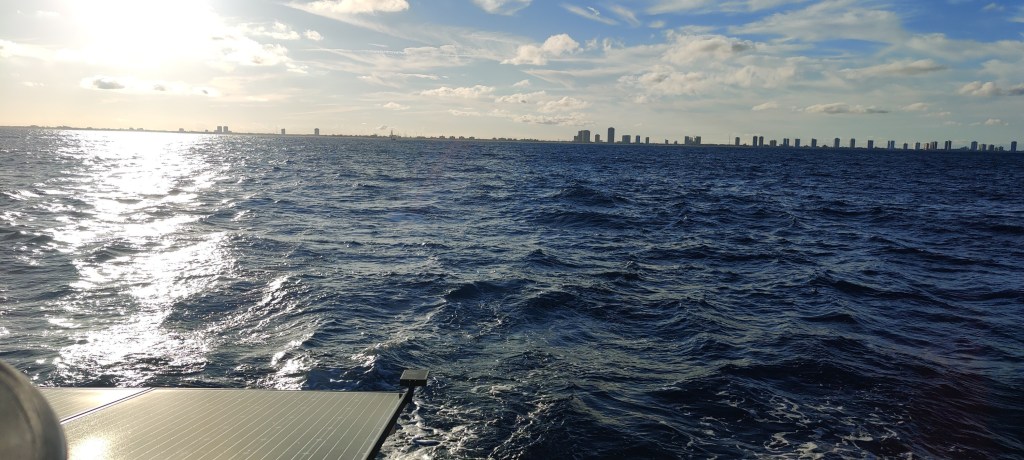 Der Wetterbericht, von Beat von der San Giulio ausführlich gesendet🙏, versprach beste, also ruhige Bedingungen auf dem Golfstrom für den späteren Nachmittag des 26.12. 23. Wir haben uns also für die Brückenöffnung um 15:15 Uhr angemeldet und dümpeln mit 5 anderen Booten pünktlich vor der Klappbrücke herum.