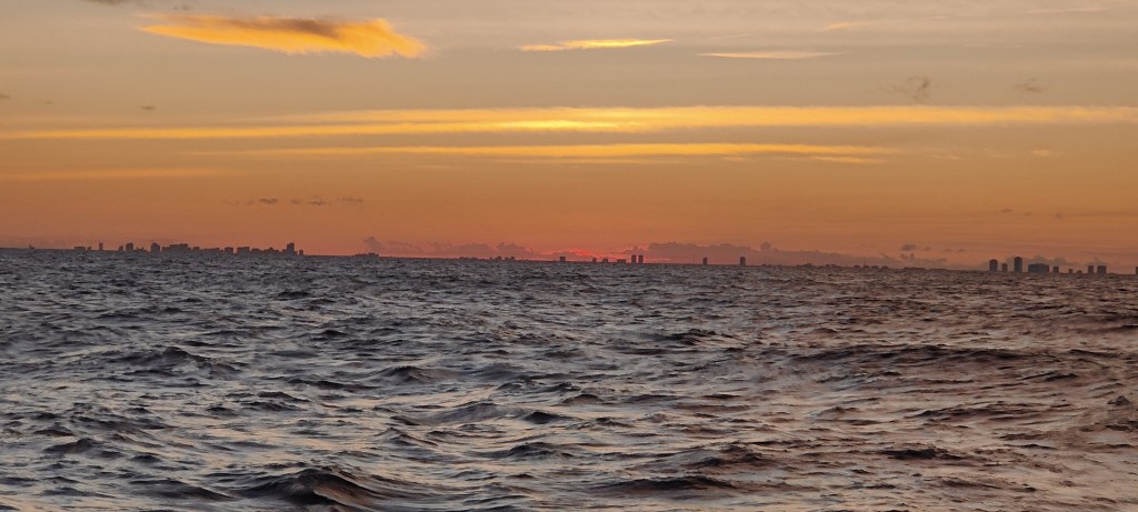 Es wird eine gute Überfahrt. Wir haben die nördliche Route gewählt. Die ist zwar länger, ermöglicht aber die entspannte Einfahrt auf das flache Wasser der Abacos und anschließend ruhiges Fahren geradeaus unter Autopilot. Die meisten anderen Boote motoren südlich um Abacos und Grand Bahamas rum.