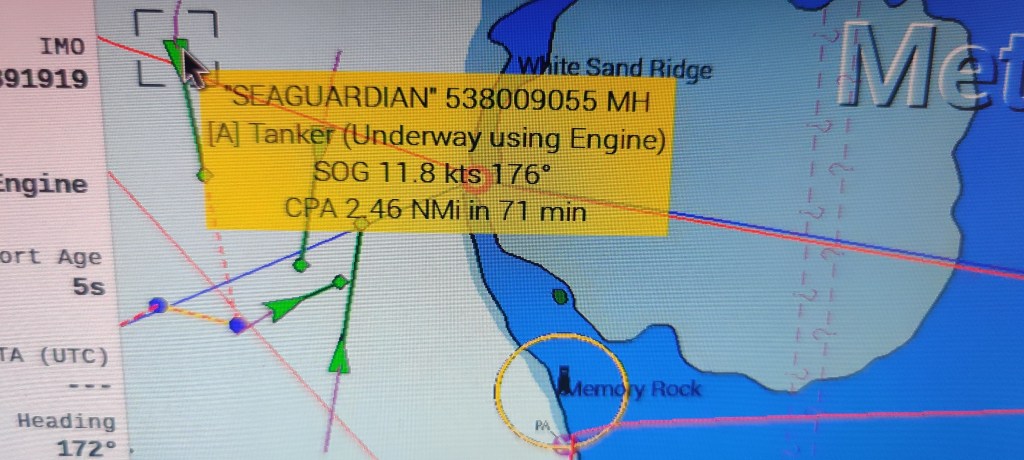 Mit uns ist ca. eine halbe Stunde früher ein großer Katamaran auf den gleichen Kurs gegangen. Er fährt ohne Segel, nur mit Motor. Den Frachter von rechts ignoriert er wohl, denkt vielleicht, er hätte das Glück gepachtet. Funkt nicht, fährt stur weiter gerade aus. Aber der Frachter fährt korrekt und hält auch seinen Kurs. Das kracht🙈 denke ich. Aber im letzten Moment erkennt der Skipper die Gefahr und fährt einen Haken und kommt damit noch einmal hinter dem Tanker durch. Nä, da wollte ich nicht an Bord sein.