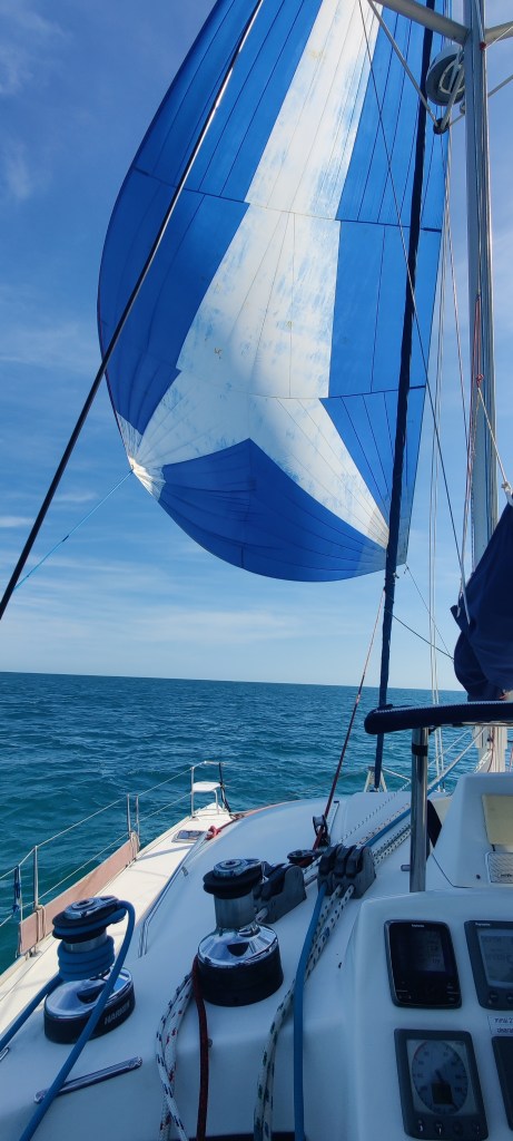 Später kommt der Wind etwas stärker und wir nehmen den Spinnaker hoch.