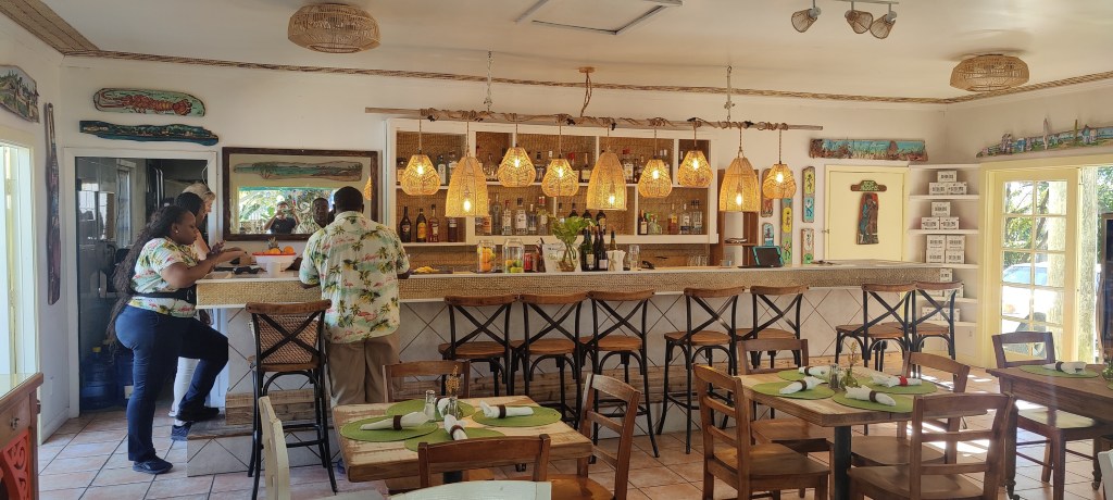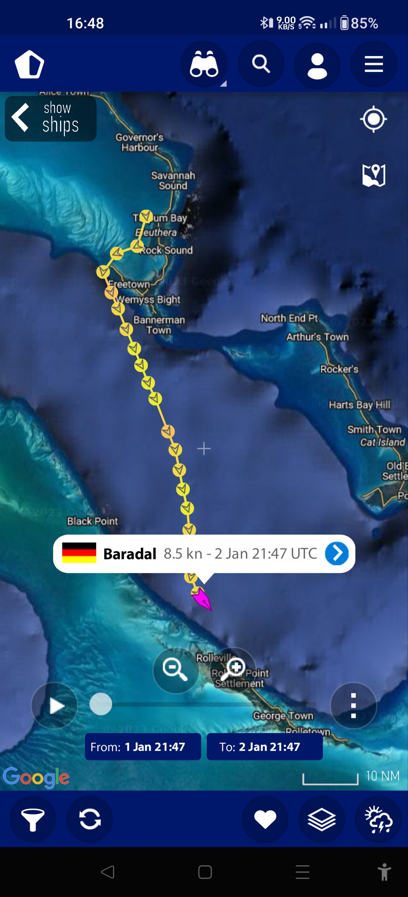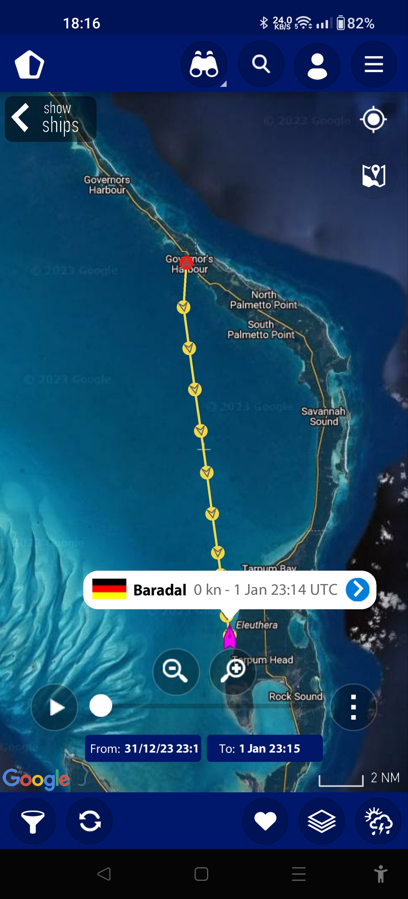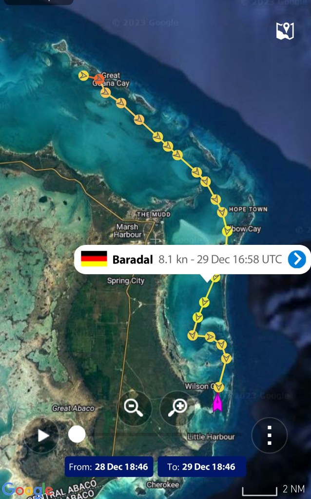 Die Fahrt bis Governors Harbour verläuft ruhig. Wir ziehen unsere Spur durch türkises Wasser. 5 m Wassertiefe erscheinen wie 50 cm, so klar ist das Wasser hier. Am Ankerplatz ist außer uns nur ein anderer Katamaran. Nix los hier! Wir gehen mit dem Dinghy an Land. Da auflandiger Wind ist, müssen wir an den Strand fahren. Kurze Hosen wären clever gewesen. Aber wir sind noch nicht auf Wärme eingestellt. So krempeln wir die Hosenbeine hoch und kommen halbwegs trocken an Land. Wir finden eine öffentliche Mülltonne für unseren Müll und gehen noch in den Supermarkt. Ja wir sind auf den Bahamas: Es ist alles etwas einfacher und das Angebot ist reduziert. Es dunkelt schon und so verschieben wir unseren Silvester-Restaurantbesuch auf den nächsten Tag. Das stellt sich als kluge Entscheidung heraus. Denn im Dunklen und evtl. leicht angeheitert, hätte die Dinghyfahrt vom Strand zur Baradal etwas schwierig werden können 🌊. Wir haben vorsorglich ein Käsefondue an Bord. Wir genießen es und schauen ganz klassisch „Dinner for One“. Damithaben wir einen schönen Rutsch in 2024🎇🥂