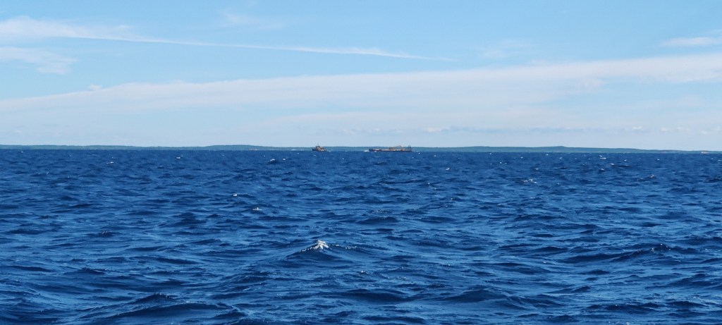 Es läuft gut, nach einiger Zeit sehen wir Frachter und Tanker. Wenn sie uns zu knapp passieren sollten, funkt Cherie sie an. Die freundliche Anfrage, ob sie uns sehen, wird nett beantwortet und der chinesische Tanker macht einen großen Schlenker um uns. Wie nett!😀