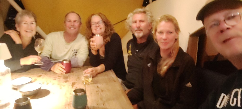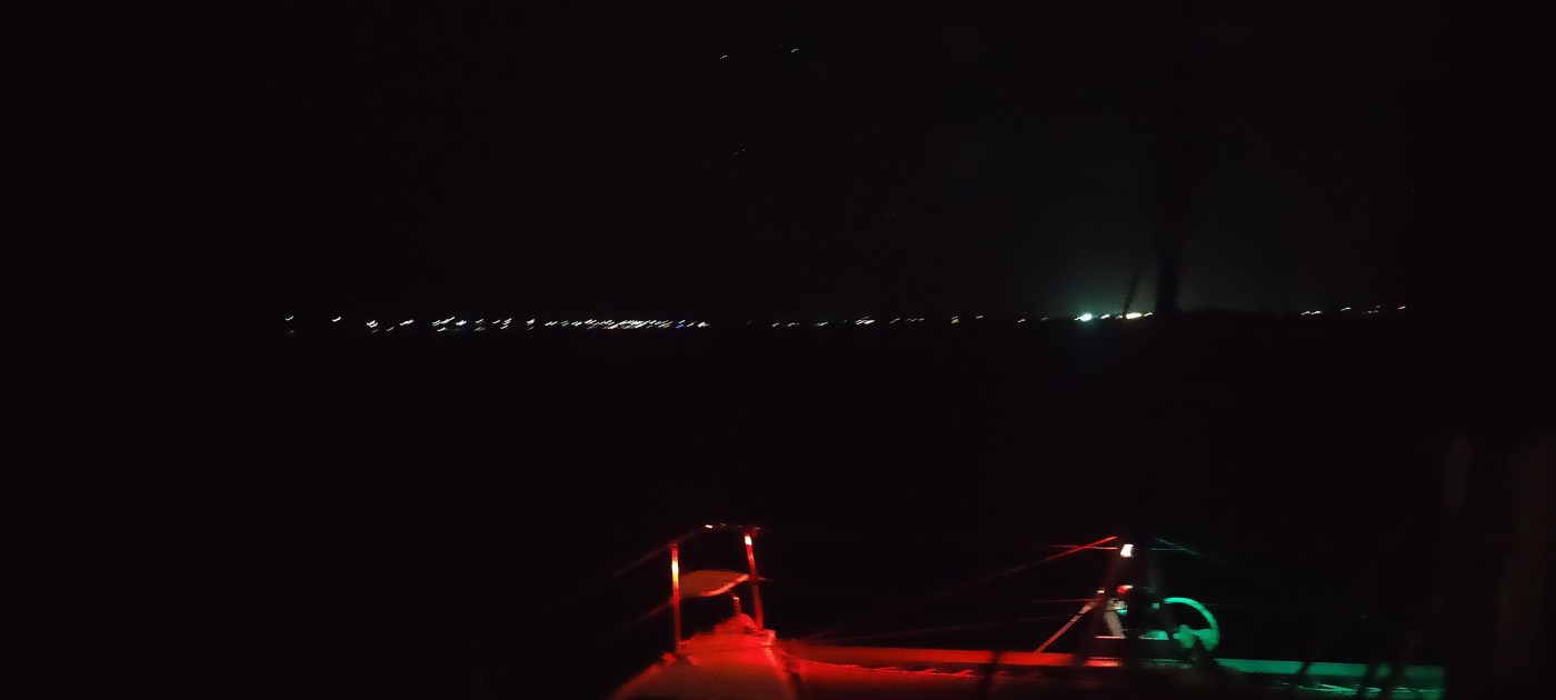 Cherie steht mit der starken Taschenlampe vorne am Bug und passt auf, dass wir kein unbeleuchtetes Boot rammen. Die Discokugel blitzt. Wir wissen, wo die Intrepid Bear auf uns wartet und wir ankern werden. Der Anker fällt, die Strecke ist geschafft, Alles gut! 🍀