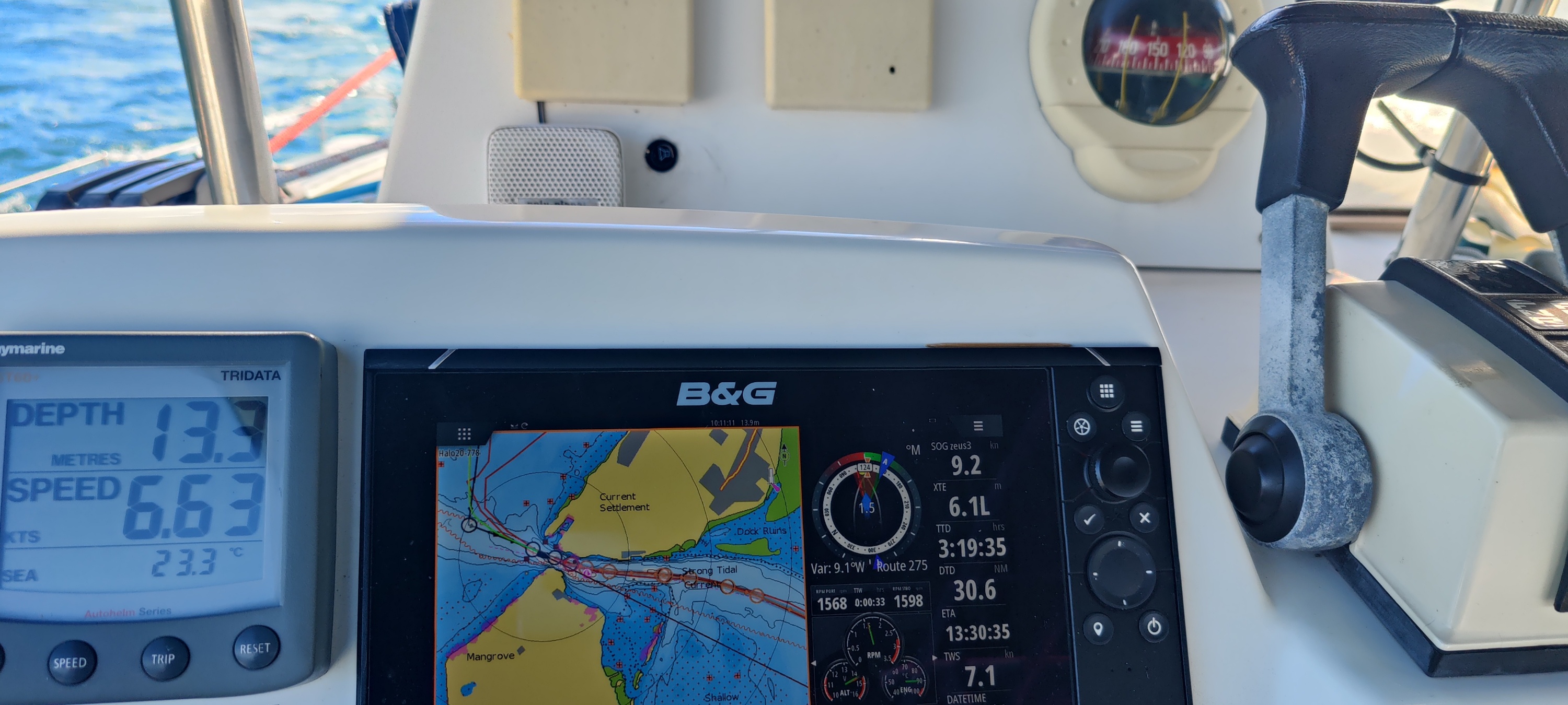 Erst einmal, dass wir Enrita und Ingolf noch treffen können und mit Ihnen auch plauschen können. Zweitens, und wichtiger, dass wir zu einer Zeit ankommen, in der die Konzentration für die Zufahrt in das Riff ausreicht! Also ist ein Schnitt von ca. 7 kn nötig. Das geht, erfordert aber etliche Kurskorrekturen. Der Wind ist manchmal ein echtes Luder und lässt uns zappeln. Aber gut, es klappt. Gegen 19:00 Uhr nähern wir uns in totaler Dunkelheit dem Aussenriff. Wir funken mit Gerd von der SY Off Piste, der direkt am Riff innen geankert hat. Stefan macht das AIS und die Discokugel auf der SY Intrepid Bear an. So wissen wir später wo wir hin müssen. Die Durchfahrt zum Riff steht an. Der Spinnaker ist geborgen, die zwischenzeitlich genutzte Genua wieder eingerollt, der Skipper schaut konzentriert auf den Plotter mit Radar und immer wieder nach vorne, ob da was kommt. . .