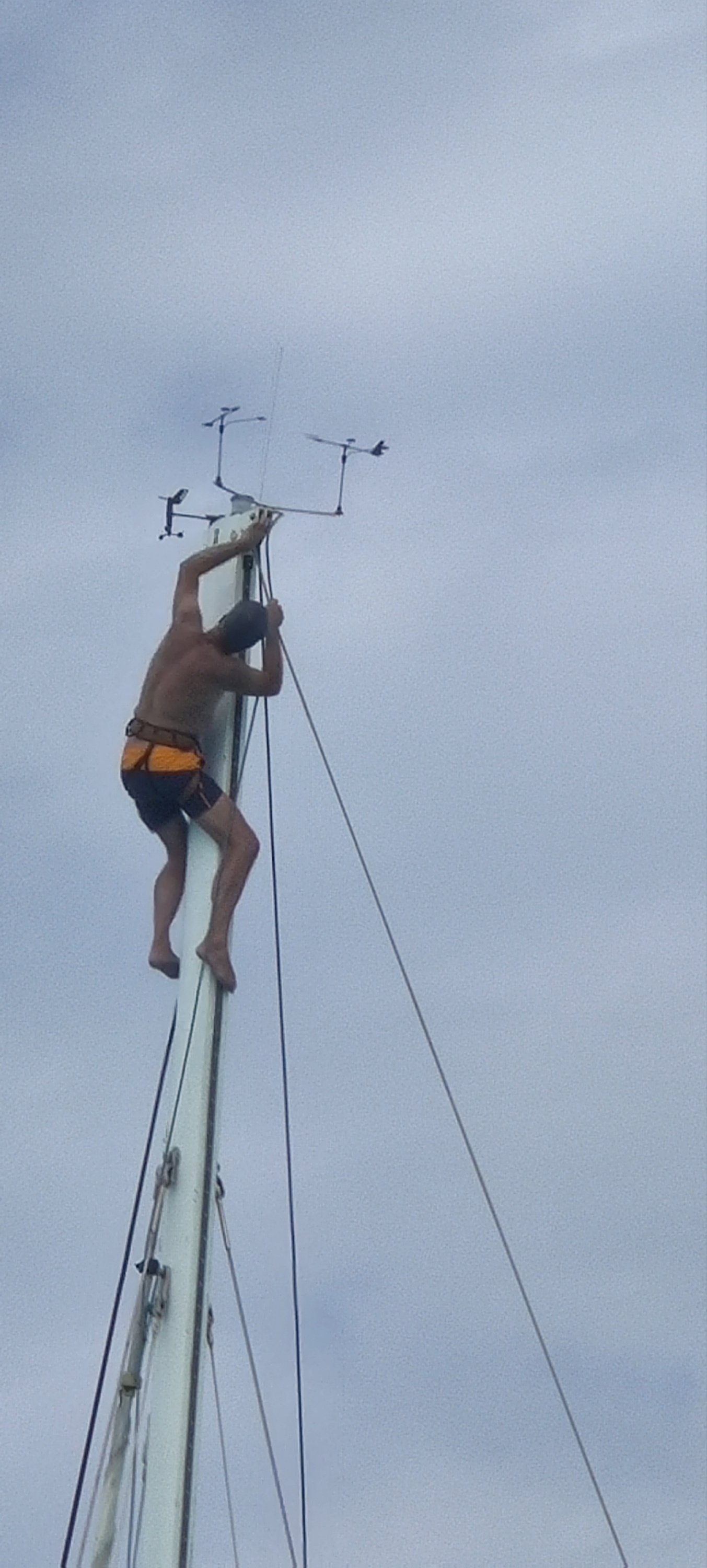 Auch andere Boote haben Sorgen. Bei Stefan muss eine Leine oben im Mast gewechselt werden. Da ich schwindelfrei bin, wird das dann zu meiner Aufgabe… Luftig war es dort oben.
