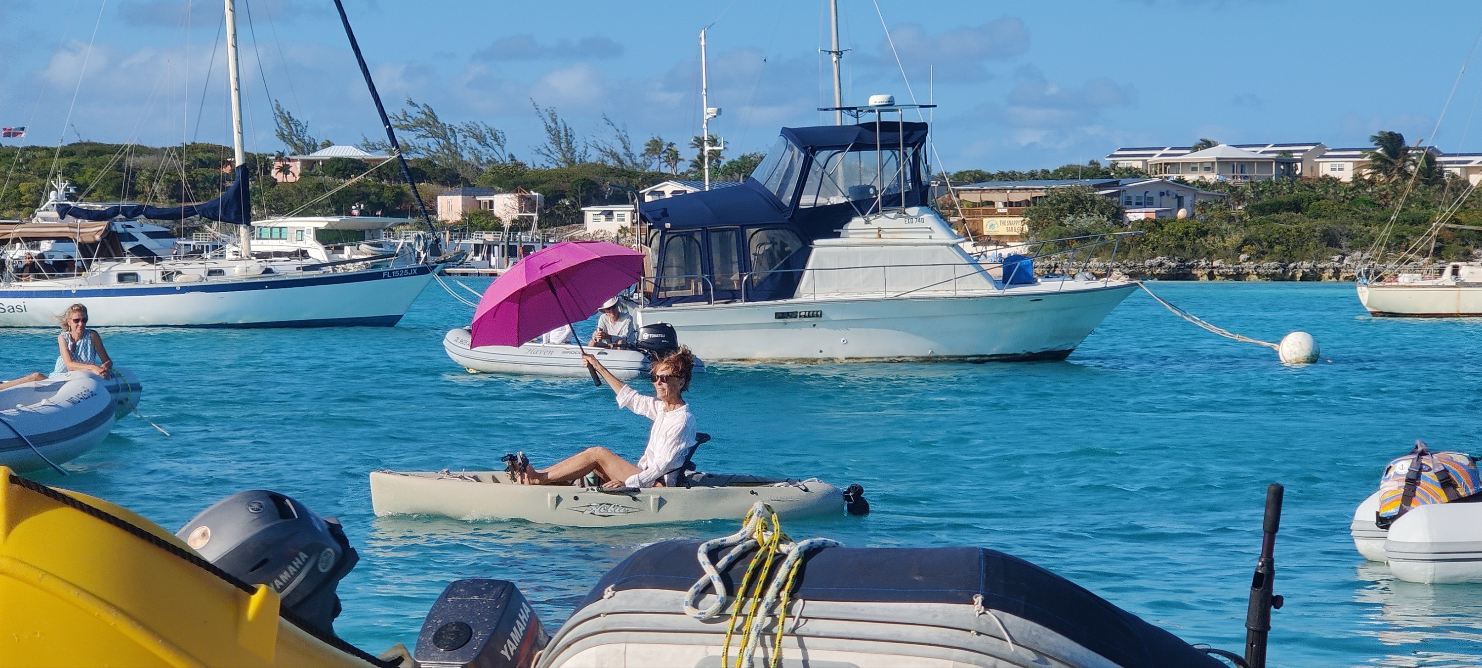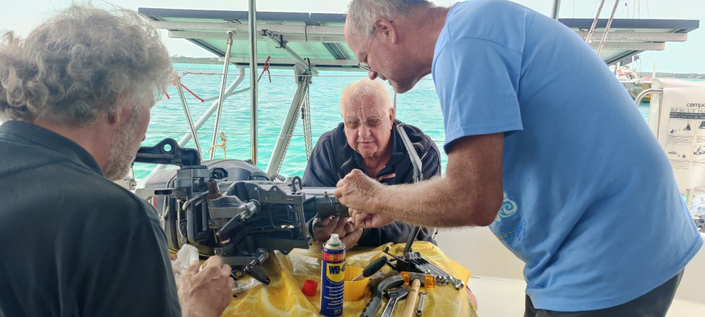 Da kommt keine Langeweile auf. Wir düsen also fleißig zu den Events. Plötzlich stirbt unser Außenborder bei starkem Wind auf dem Weg zum Chat’n Chill ab. Wir treiben und nur mit Hilfe von Stefan und Astrid, die uns in Schlepp nehmen, kommen wir wieder an Land. Eine ausführliche Fehleranalyse und Reparatur steht an. Mit fachkundiger Hilfe  und den passenden Ersatzteilen wird der Außenborder wieder flott.